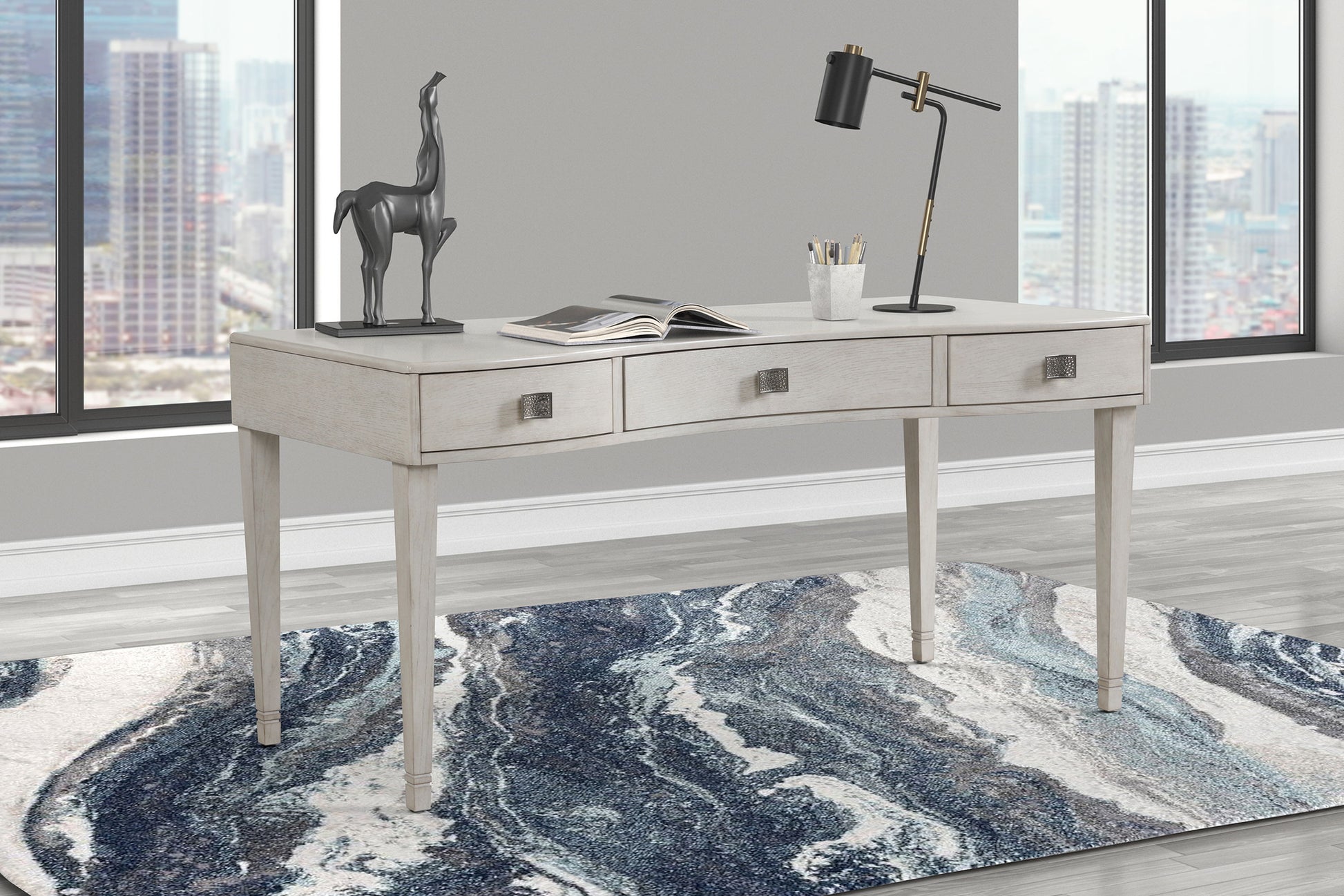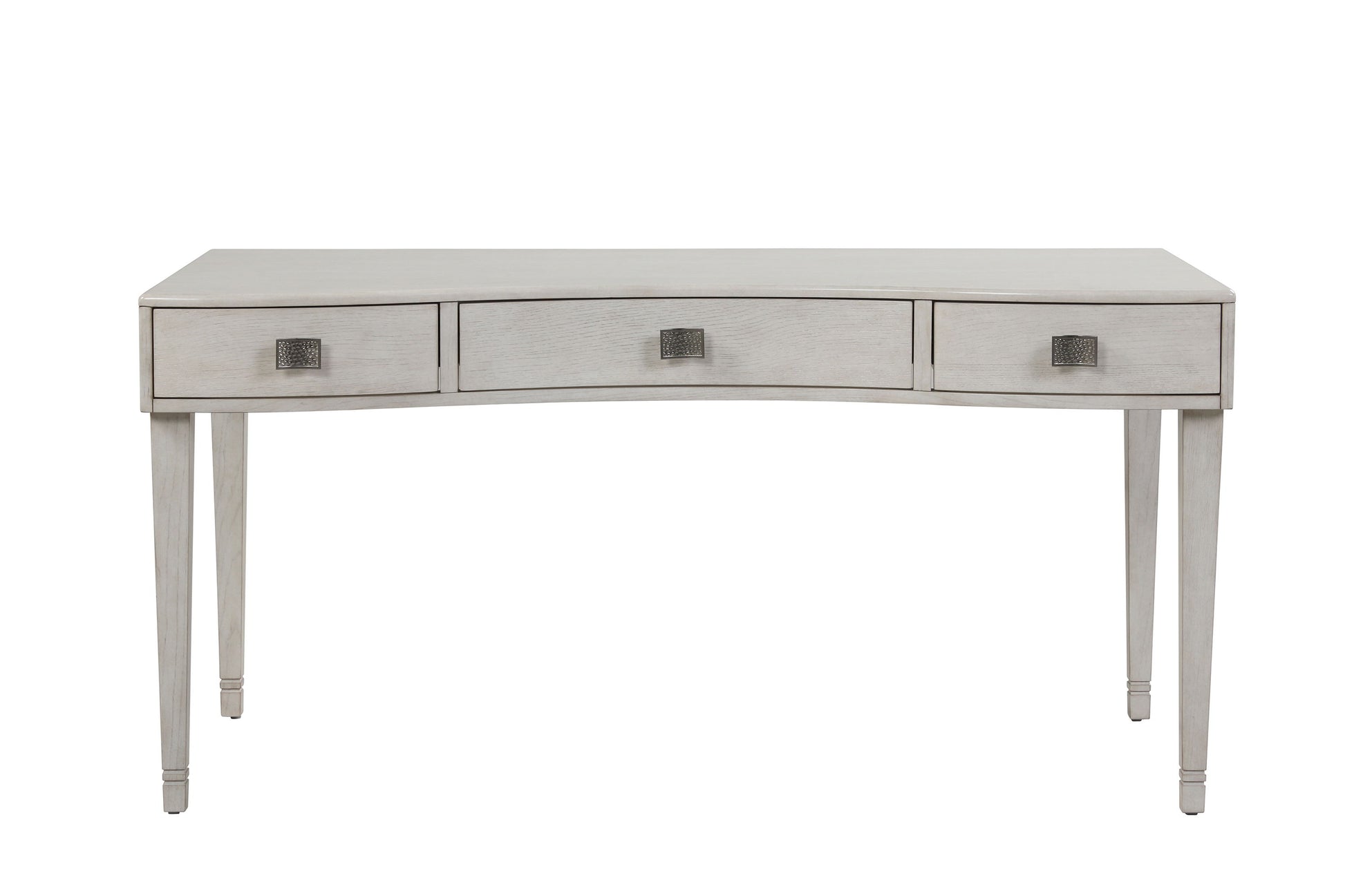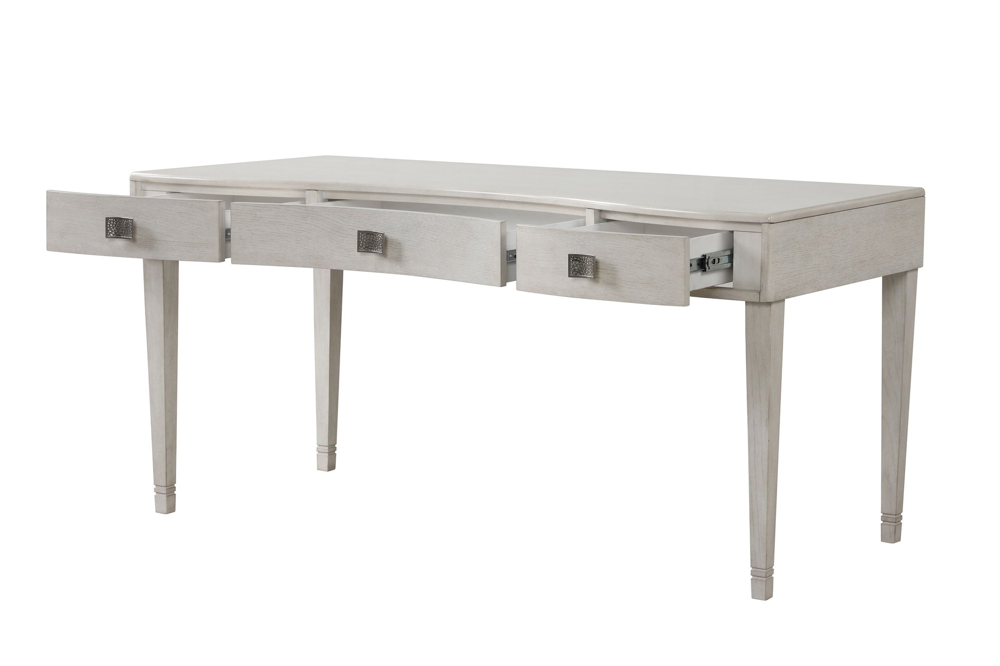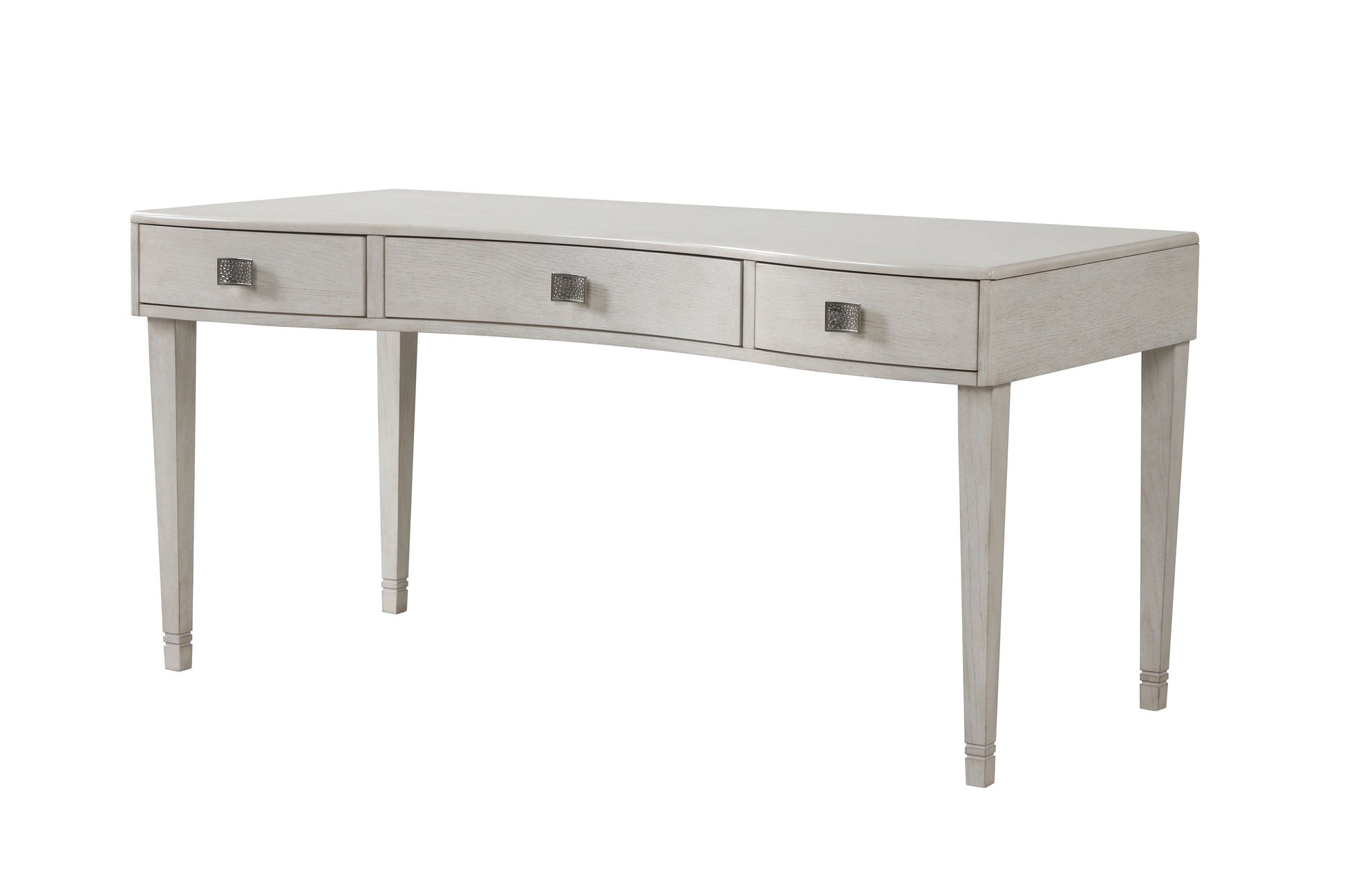 Whether you're working from home or just looking for a chic, sophisticated look for your home office, this writing desk has you covered. Featuring a Sophisticated Chiffon White finish over Oak veneers, this desk exudes elegance and class. The Textured Nickel hardware adds a modern touch that is both chic and timeless. The desk’s shapely concave-shaped silhouettes and tapered legs give it a distinctive charm that sets it apart from other desks. The attention to detail is evident in every aspect of this writing desk, from the English dovetail drawer construction that ensures durability to the sophisticated finishes that make them a joy to behold. Upgrade your home office with a writing desk that combines the functionality you need with the high-end design of a professional designed home.