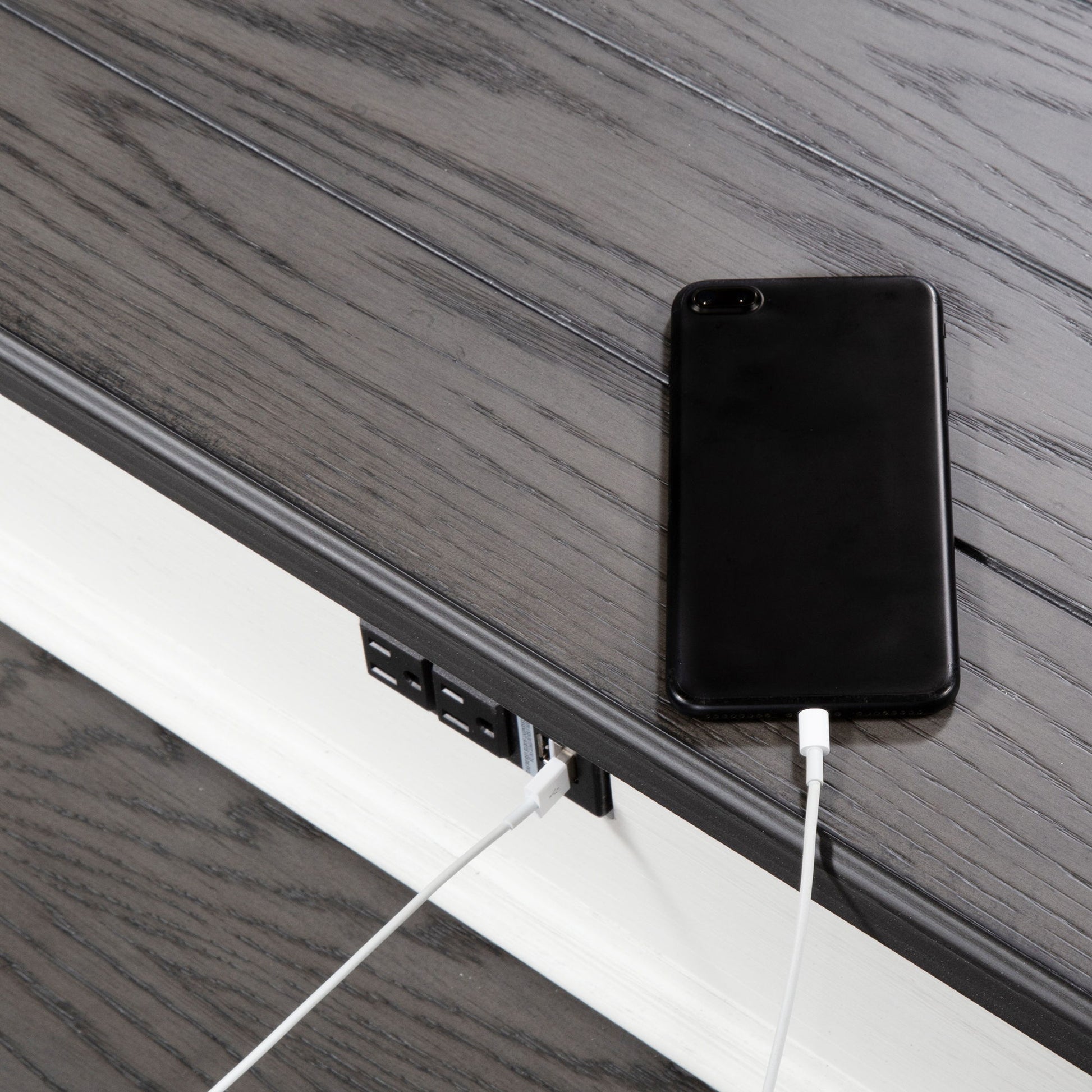 Elevate your space with the Allyson Park console bar table. Crafted of pine solids and veneers with cathedral white oak tops, this piece features a wire brushed white finish with a planked charcoal top, three storage cubbies, two electrical outlets and USB ports for easy access charging, and is anchored with square tapered legs and a slat style end panel. This classic console bar table would make a gorgeous addition to your casual styled home, perfect for behind your sofa.