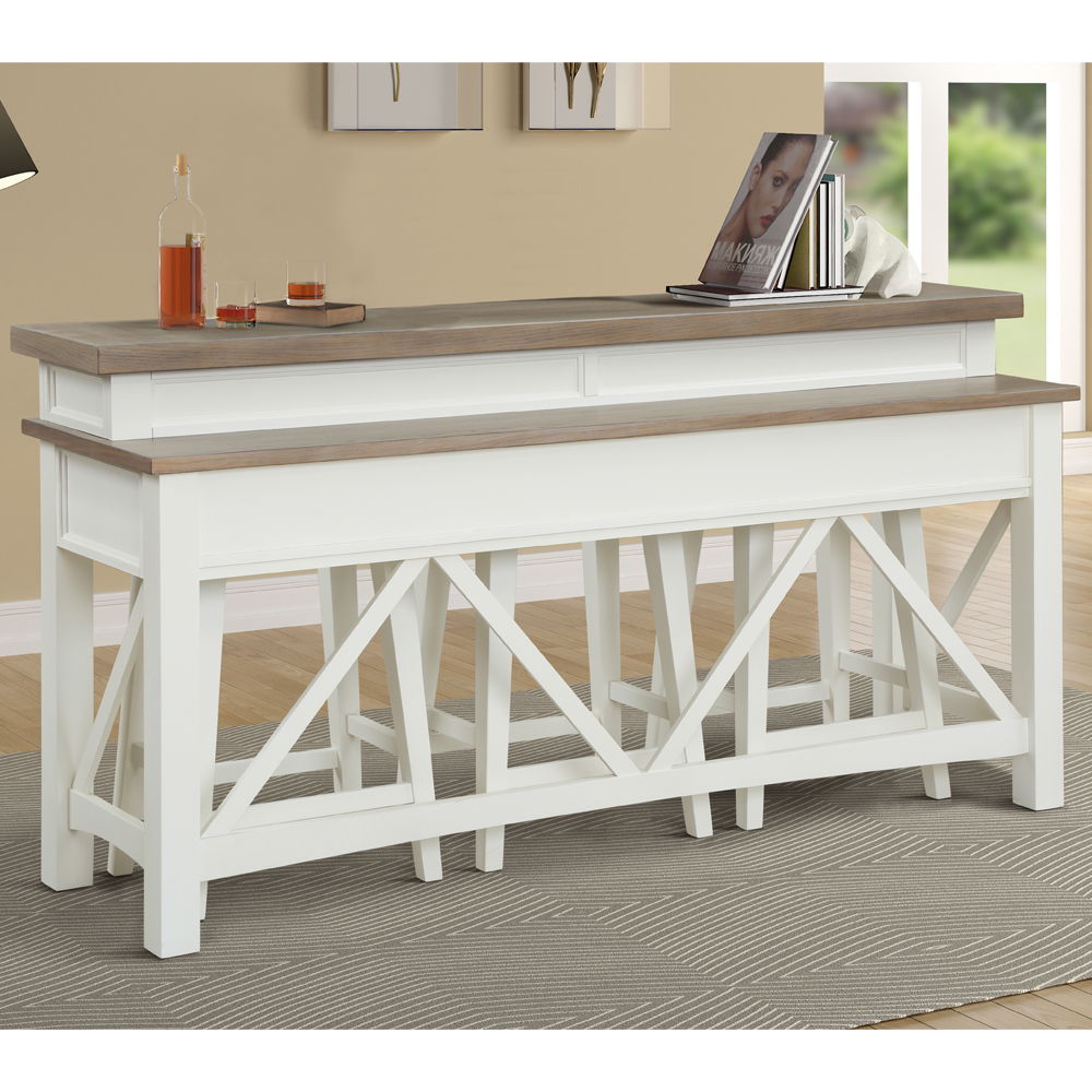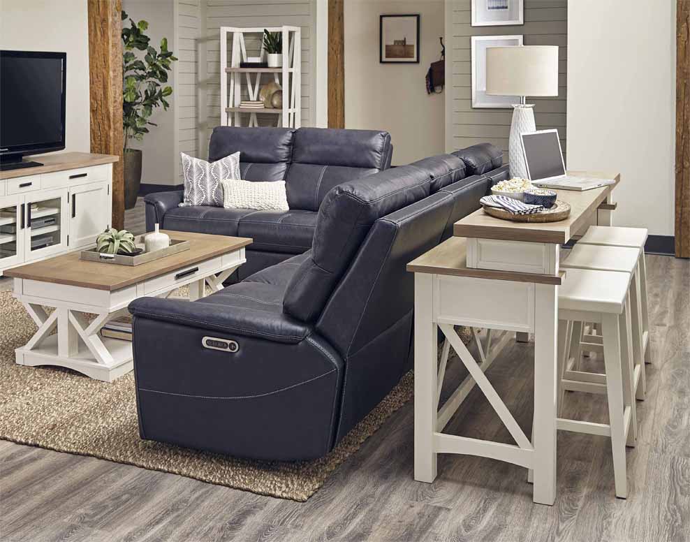 Destined to be the new hub of your home, the Everywhere Console with 3 Stools, from the Americana Modern collection combines style and functionality. Place it behind a sofa or in a nook to create a flexible casual dining area. Its crisp white painted Cotton finish is accented with a contrasting wood-tone top in Weathered Natural. A multifunctional Power Center with dual AC outlet and a dual USB port makes it an ideal location for working from home or surfing the web. Two coordinating backless stools in Cotton complete its casually elegant look.