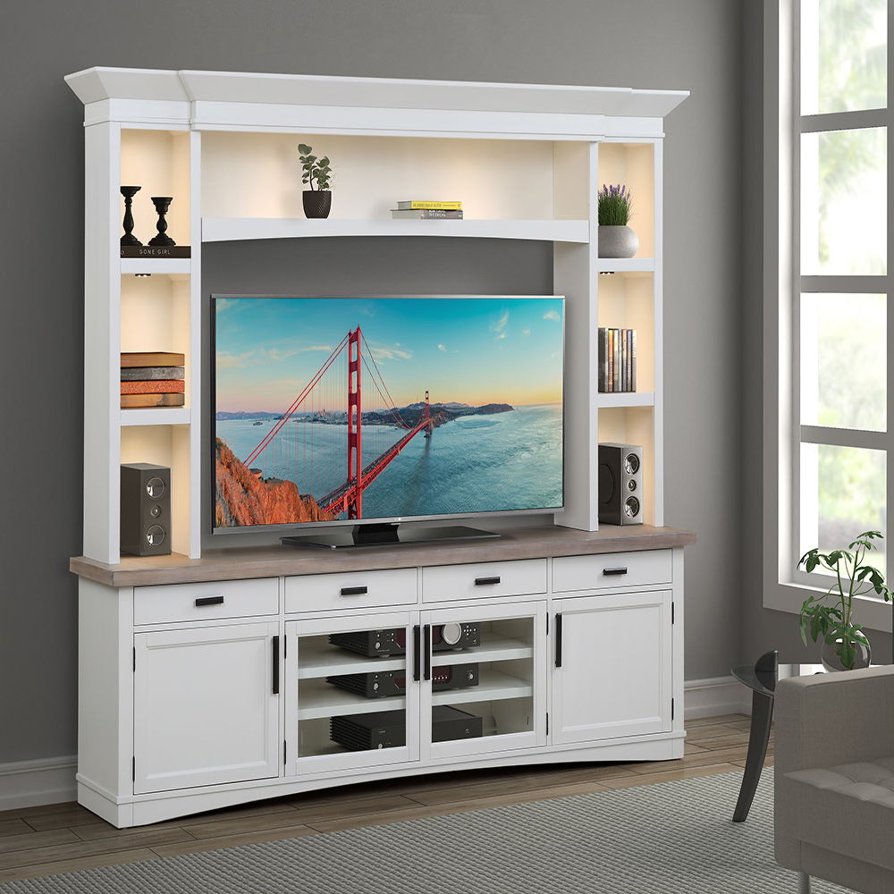 Surround your television and components in classic style with this 92-inch TV Console with Hutch. Simple yet elegant, its classic silhouette is finished in a soft with a contrasting wood-grain top in Weathered Natural. Part of the Americana Modern collection, this multifunctional media solution features adjustable wood shelves, storage drawers and compartments, 3-way LED touch-lighting, glass doors with wood trim, and cord management.