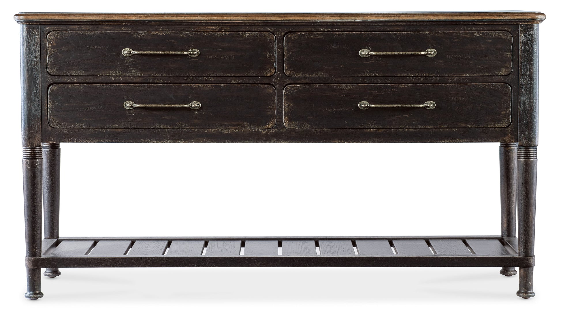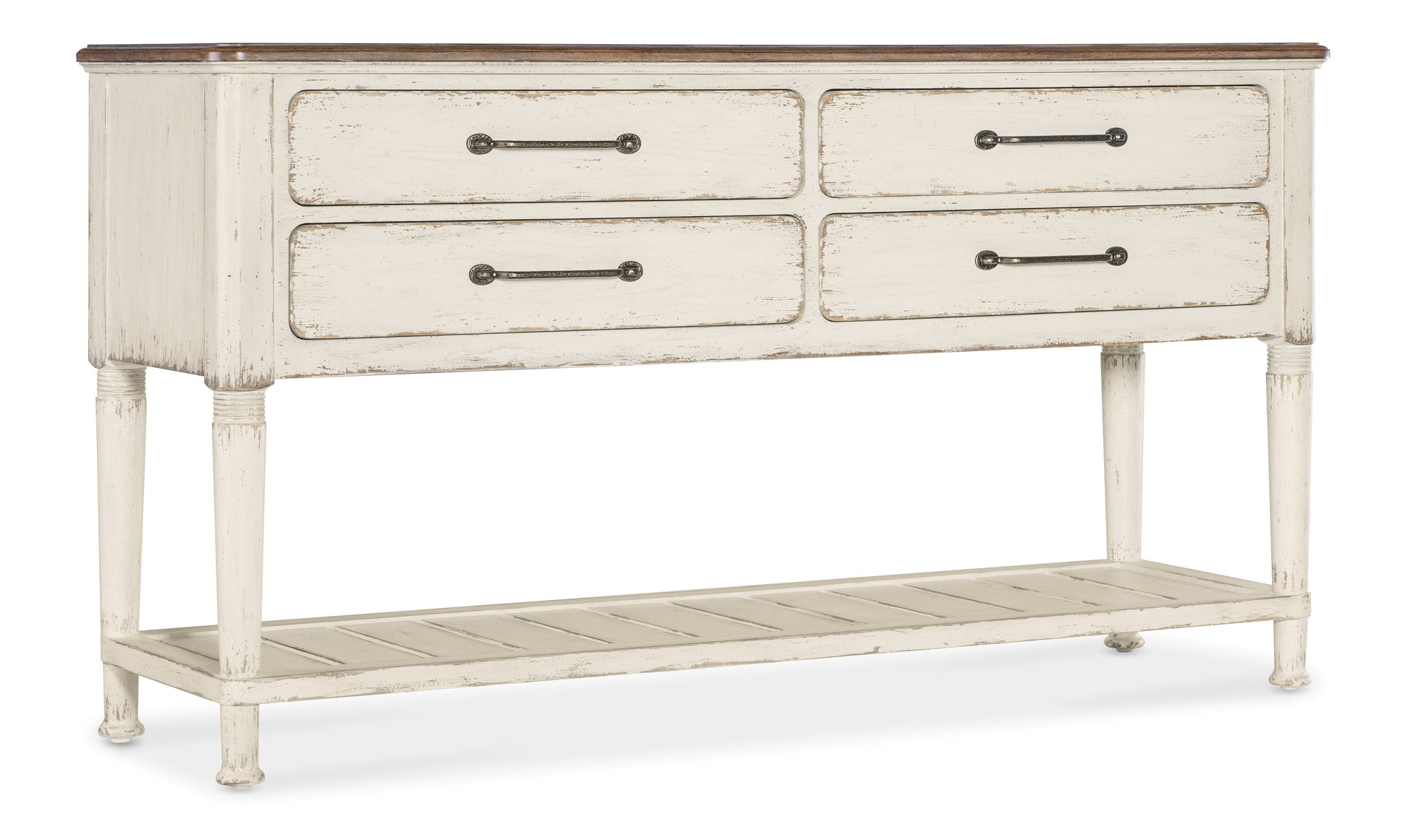 Reimagining a historical design with a fresh take on finish, function and form, the Americana Server has a nostalgic silhouette with details including one fixed plank shelf on the bottom and carved accents on the legs. Crafted in Oak Veneers with a Solid-Wood Edge Top, it is finished in the deep tone on the case with the gentle finish on the top. Featuring 4 self-closing drawers, the top left drawer has removable felt liner and the top right drawer has removable felt-lined silverware tray. The interior finish is Honey.