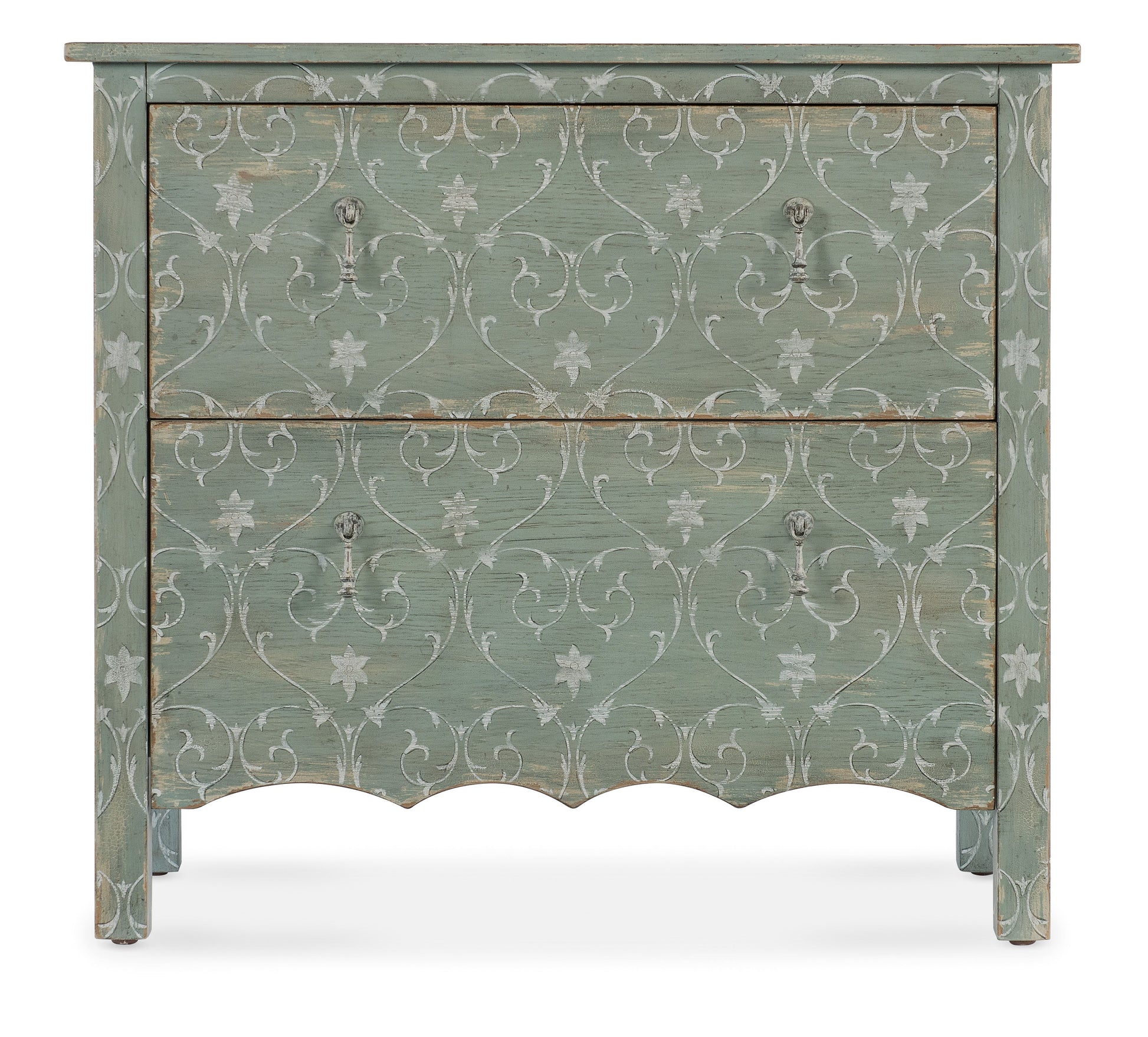 In a classic, charming design with a nostalgic flair, the Americana Two-Drawer Accent Chest has a scalloped-bottom shape and is finished in a soft Antique Green with distressing and rub-through over Oak Veneers. A white scroll pattern covers the exterior, and the interior has a Honey finish. Metal alloy tear-drop pulls in an antique pewter finish have white hang-up accent. Two self-closing drawers.