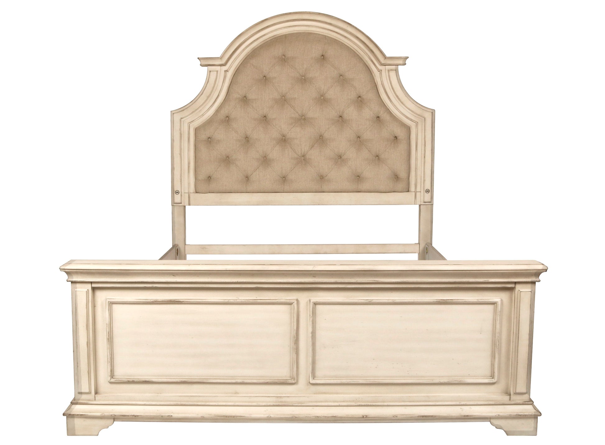 Romance your bedroom with the New Classic Furniture Anastasia Bed, a marvel of real wood construction crafted from solid poplar and oak veneer for unparalleled durability. The heirloom finish, achieved through a meticulous multi-step process involving wire brushing, clefts, rasping, threading, and rub throughs, creates an upscale, vintage look with each piece being one-of-a-kind. The creamy off-white stain, enhanced with burnishing, exudes vintage French country cottage charm. Softly arched molding frames the easy-care 100% polyester button-tufted upholstered headboard, creating a welcoming ambiance. This bed goes beyond aesthetics with functional USB charging ports on either side of the headboard, providing a convenient place to charge devices. All furniture complies with safety standards, ensuring your comfort and peace of mind. With a 1-year limited warranty, the Anastasia Bed seamlessly combines timeless design with modern functionality for a secure and stylish addition to your bedroom.