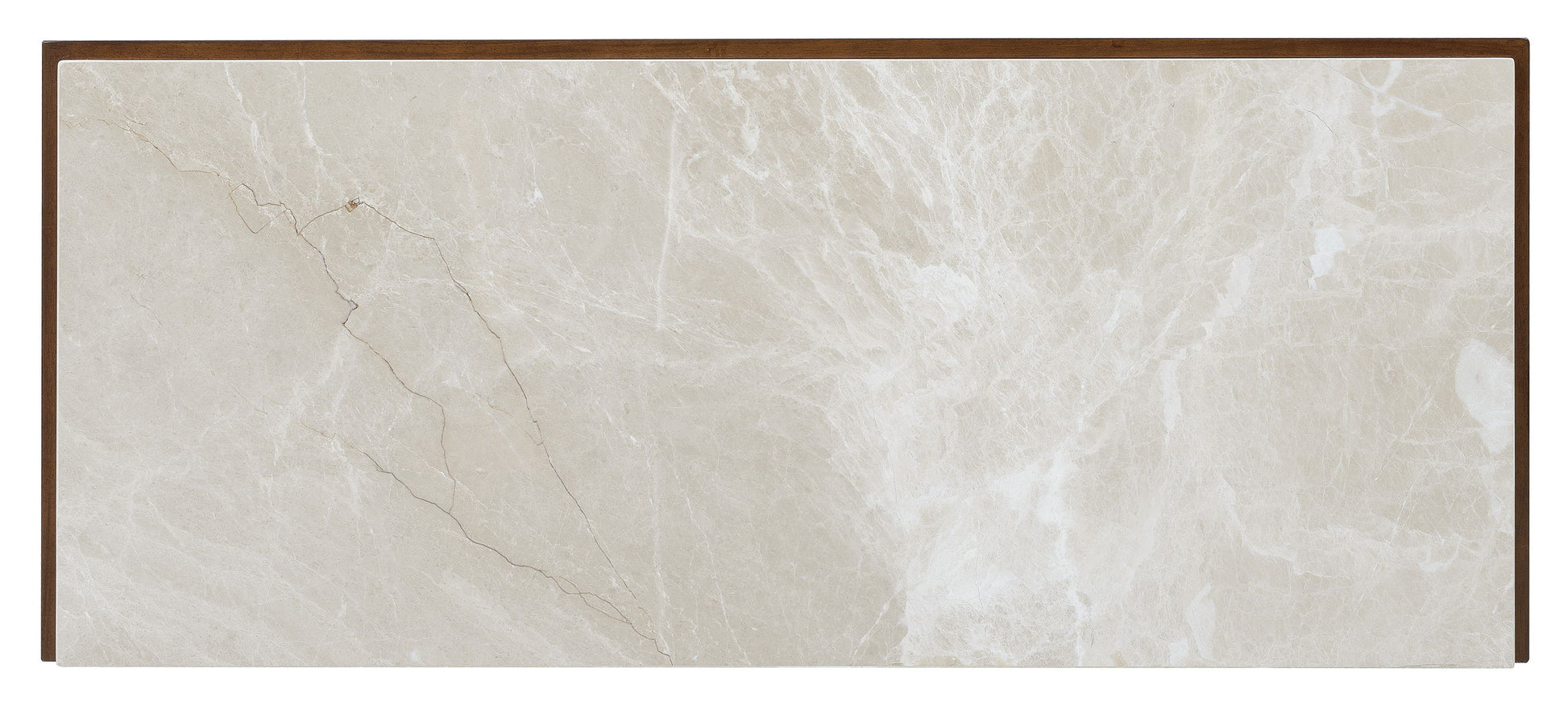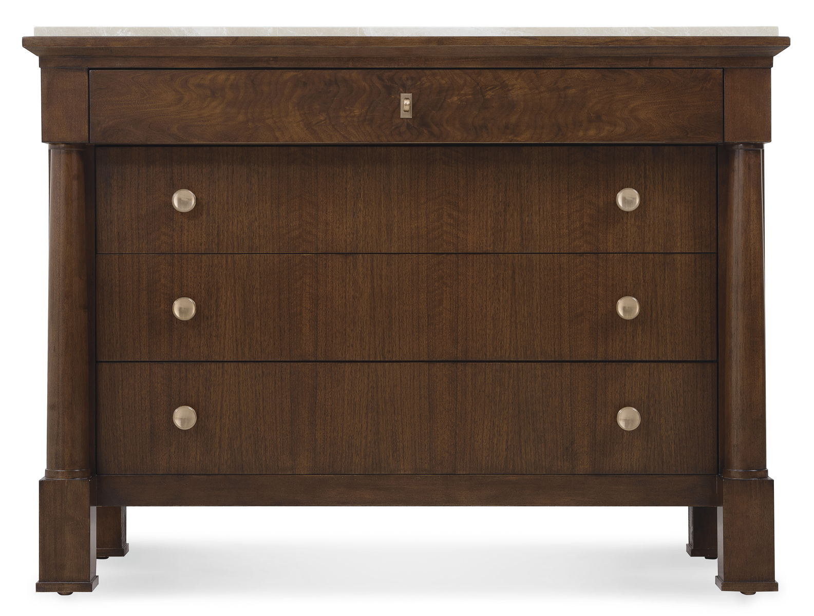 Add practical elegance to your bedroom with the Archives Four-Drawer Chest. Crafted with a Classic Walnut finish over figured quartered walnut veneers, this chest exudes timeless charm. It features four drawers, including cedar-lined bottom drawers, and is topped with a Castle Grey marble surface. The custom satin brass hardware completes the luxurious look of this beautifully designed chest.