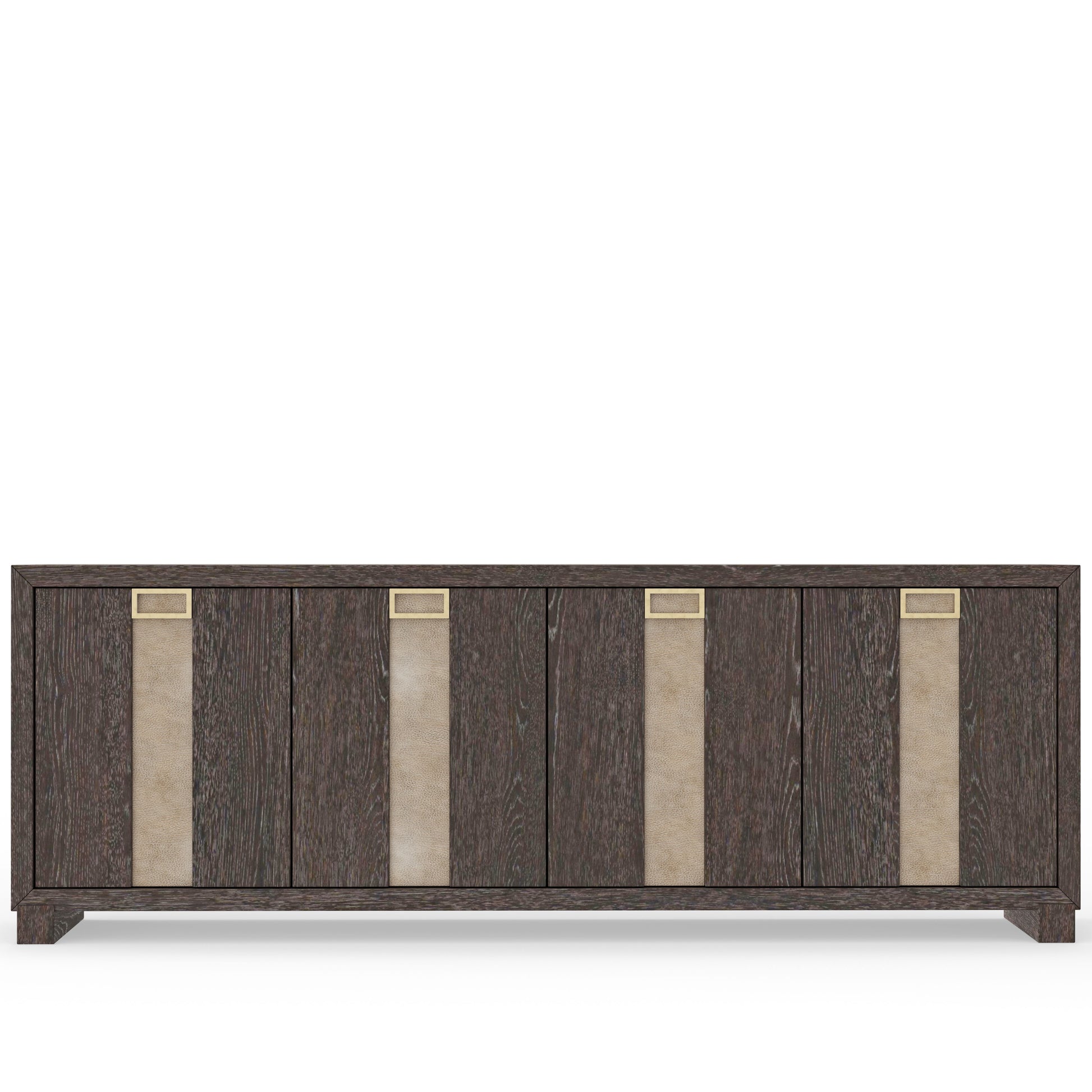 Stow away items in style with the Ascent Convenient 90" Console. Ascent features interior console storage is complete with adjustable shelving and a hidden drawer. Contrasting shagreen textured panels are set against beautiful dark chocolate oak veneers, creating a modern classic aesthetic that will never go out of style.