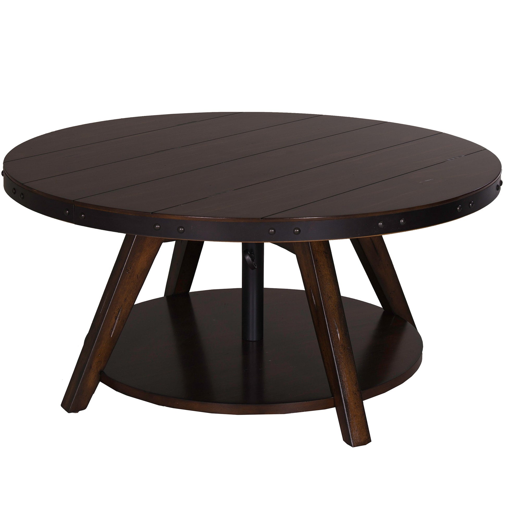 Enhance your space with the traditional Aspen Skies motion cocktail table. Crafted of pine solids and New Zealand pine veneers with metal accents, this piece features a brown finish, appealing planked top, bottom shelf design for additional storage, metal accents with nail heads outlining the table top, and an adjustable tabletop extending from 16" to 24". A wonderful addition to any rustic style space.