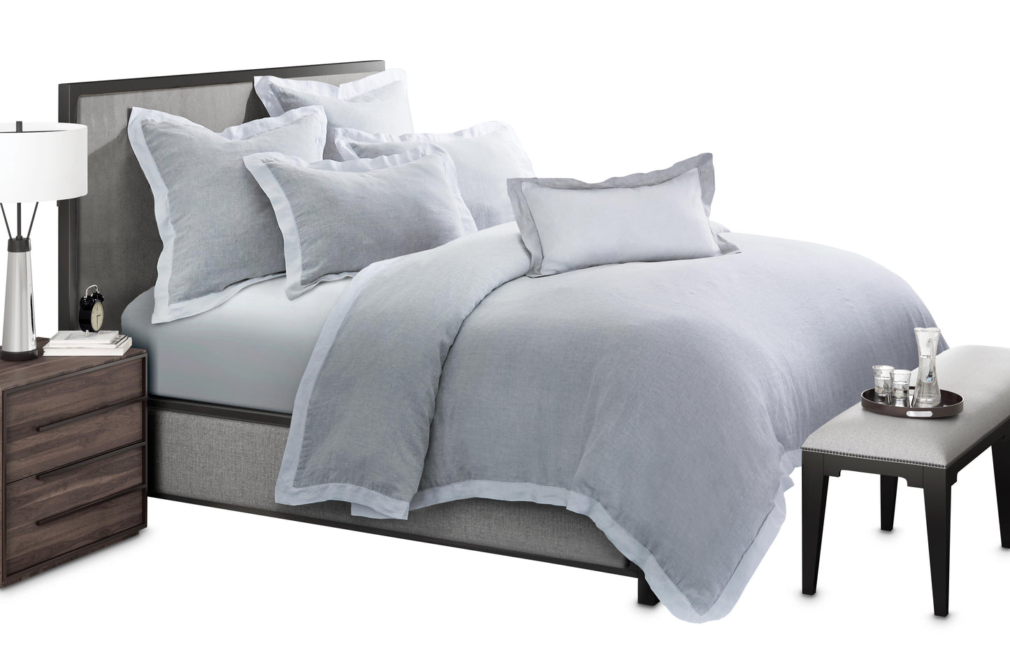 Update your master suite with the wondrous qualities of Belgium linen. Over time, the softness of the linen will be enhanced with every washing. Subtle hemstitch contrast detailing on the linen enhances the luxury of the bedding duvet set. The feather filled boudoir pillow, with removable cover, contrasts the main pattern.
