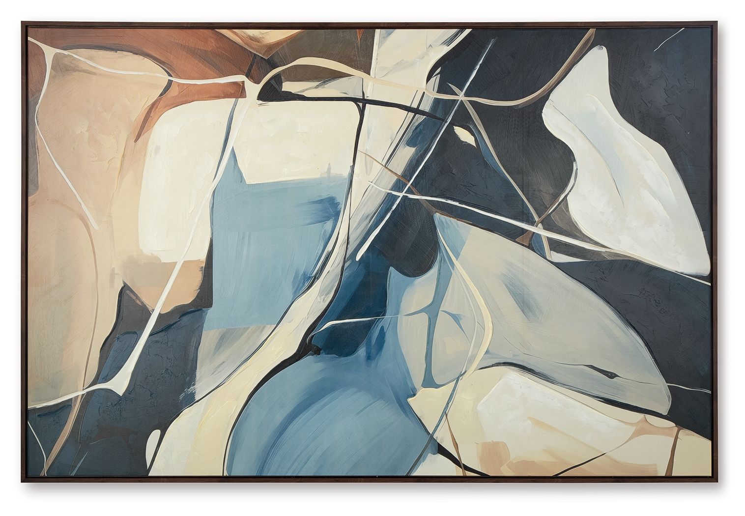 Eye-catching shapes make for an intriguing abstract design in this wall art. Its blue, brown and tan hues add a wonderfully warm and neutral touch to your home. And when it's time to refresh your space, you have the option to hang it one of four ways. Hand-painted embellishments make each piece unique.