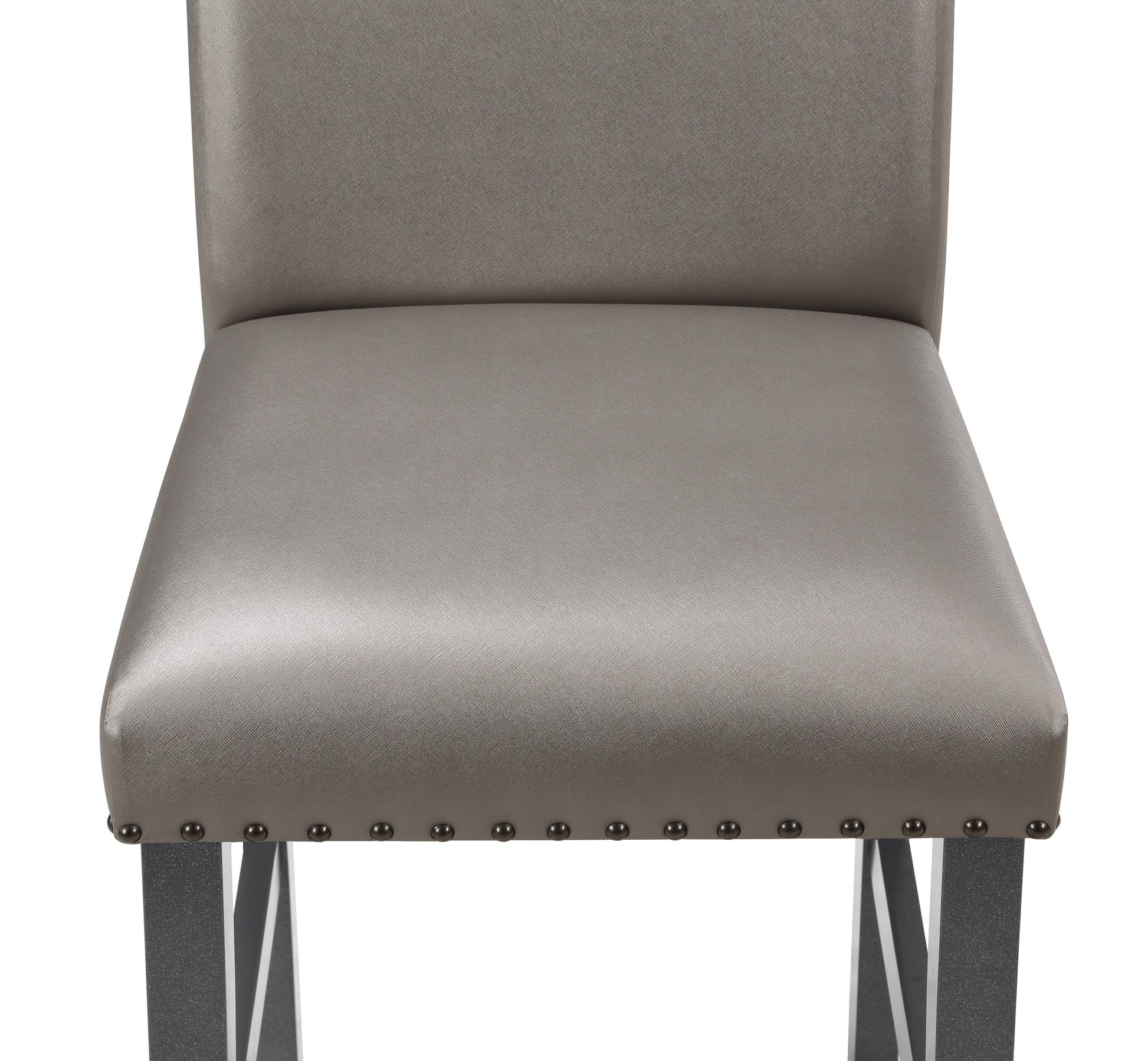 Bring sophistication to your space with this handsome counter height dining group. The expandable table has an array of features, including closed storage and tempered glass inserts. The rich gunmetal finish is accented by alligator embossing and diamond etching. The seating is upholstered in a durable pewter vinyl and nail heads trim the chairs.