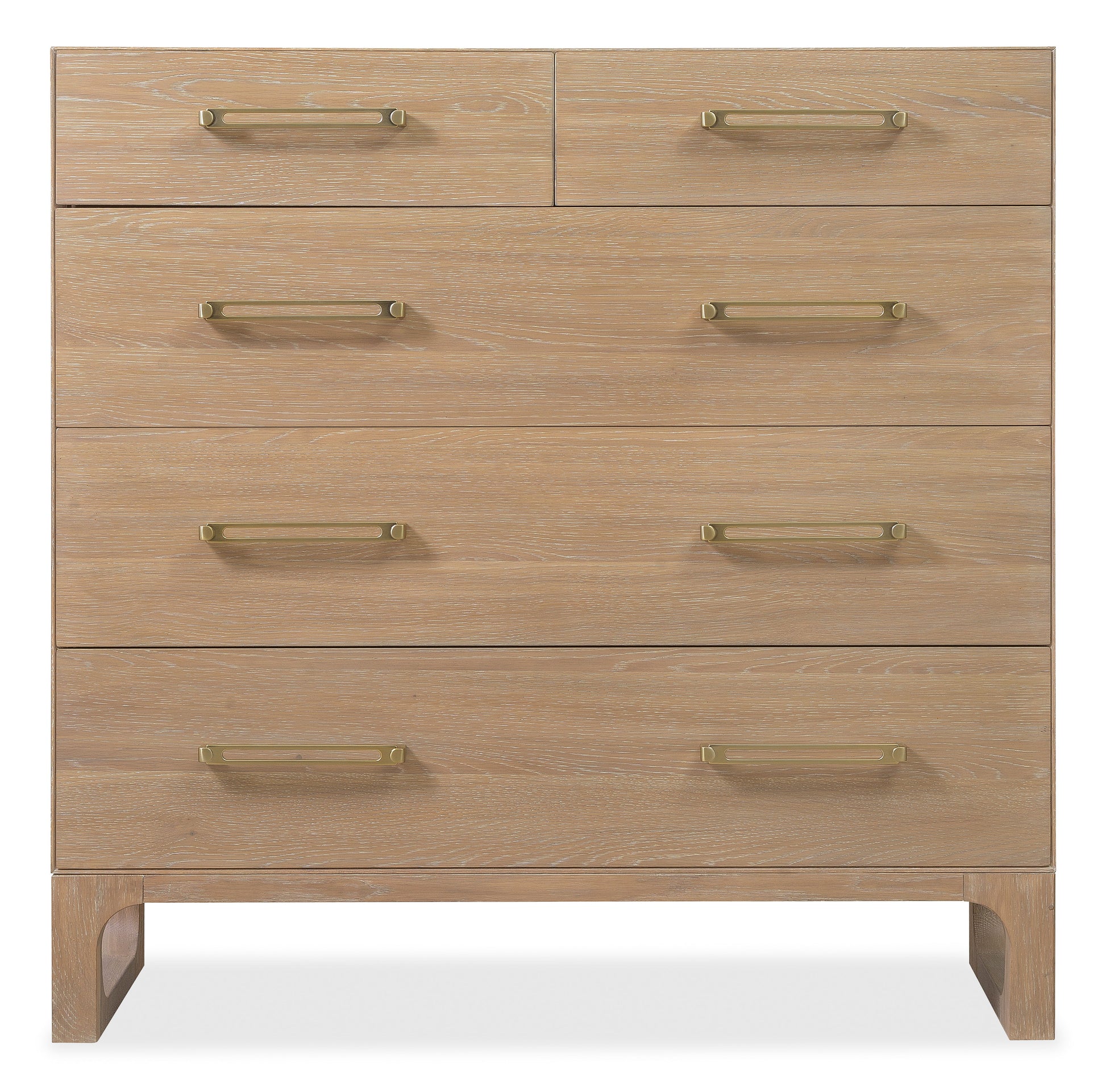 The Banyon Bay Dresser is a functional and stylish addition to your bedroom. Crafted from solids and oak veneers, it showcases a finish enhanced by a multi-step process with wire-brushing and cerusing for added texture. The stainless steel bar hardware in a soft finish adds a modern touch. Featuring drawers, including a jewelry tray and cedar-lined bottom drawer, this dresser offers ample storage space with a refined look. Perfect for a contemporary bedroom setting, it blends geometric design with natural materials for a cohesive and casual look.