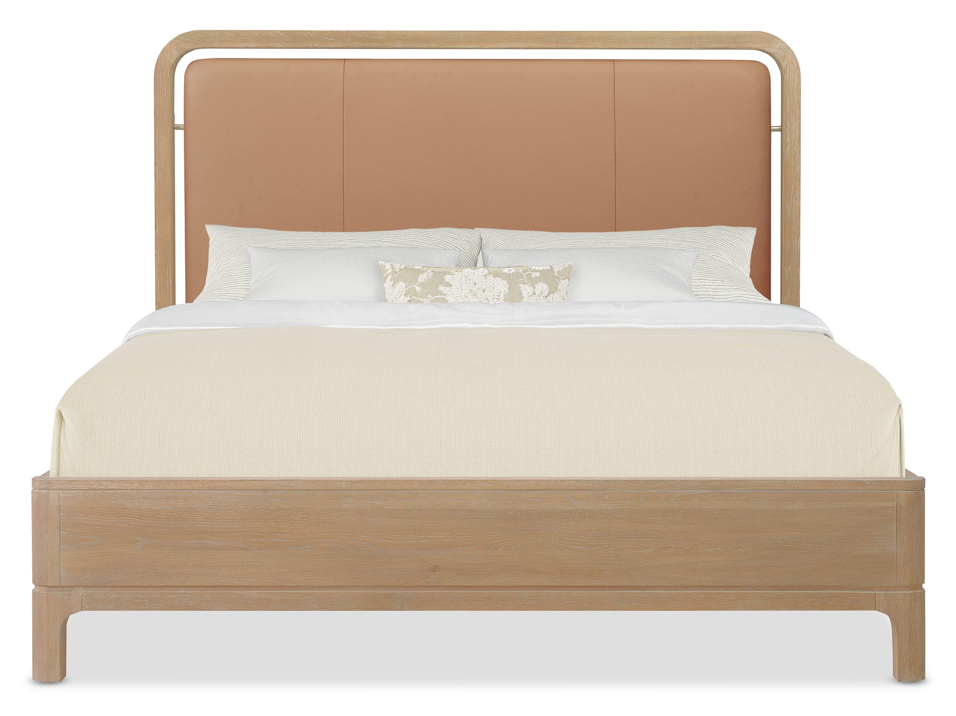 The Banyon Bay Panel Bed brings together modern design and natural materials. Made from oak solids, oak veneers, and leather, it showcases a multi-step finish with wire-brushing and cerusing for added texture. The bed includes a headboard, footboard, and rails, with the leather-upholstered headboard featuring an open frame and metal supports. Its contemporary aesthetic fits perfectly into urban, coastal, or mountain settings, offering a stylish and cozy retreat.