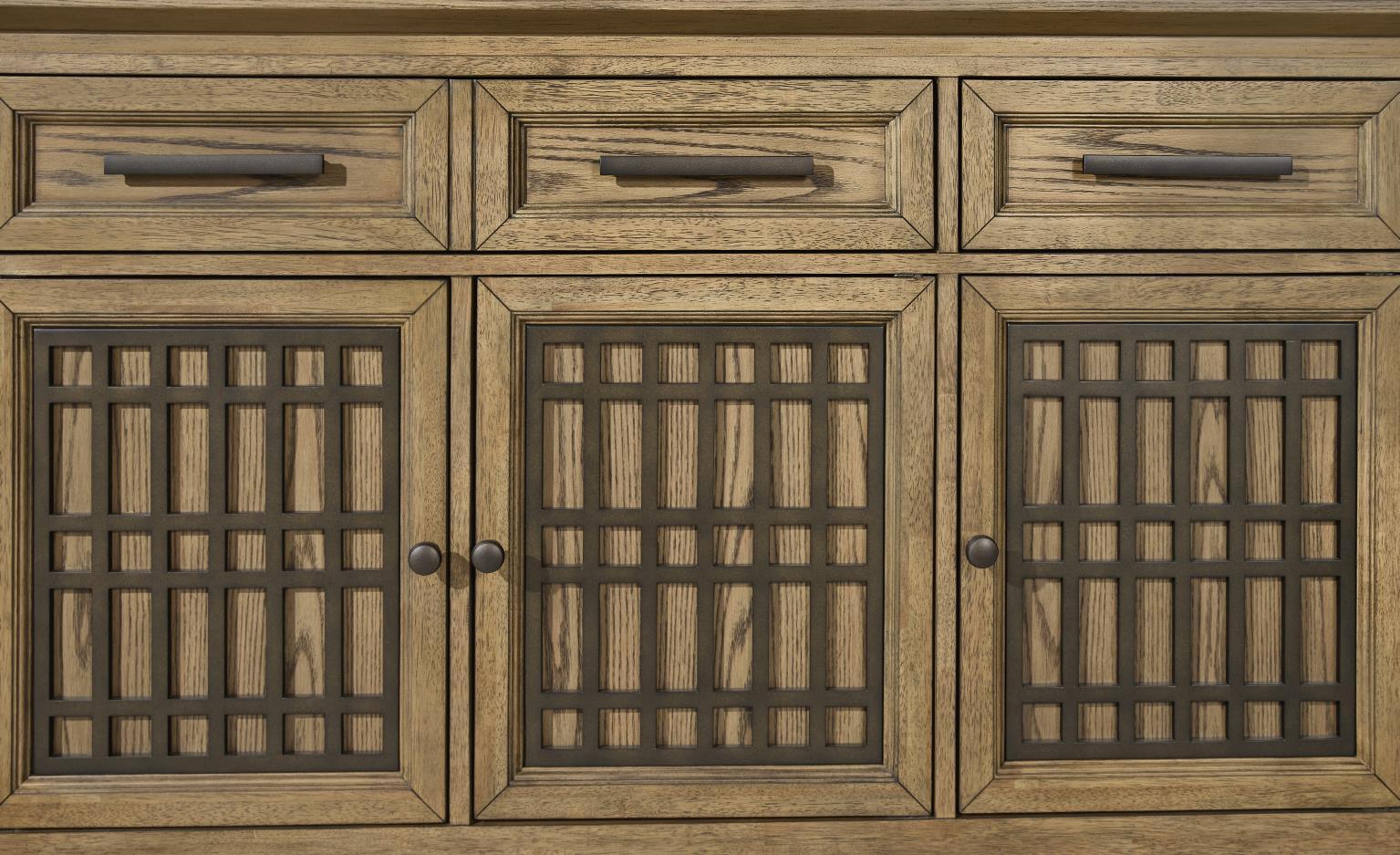 Crafted of Hardwood Solids with Oak Veneers in a Dusty Barley finish the Beacon Hill bedroom and dining furniture collection has an Arts & Crafts-inspired design that offers a fresh traditional look. Striking grid-like wood fretwork on the headboards and some case pieces are finished in a contrasting metal-colored finish that matches the Oiled Bronze hardware.