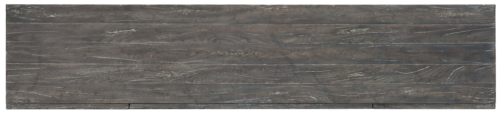 - Finish Description: Shale: a soft grey with natural wood undertones. Mottled copper hardware. Distressing includes rasping, chopping, gouging and worm holes.