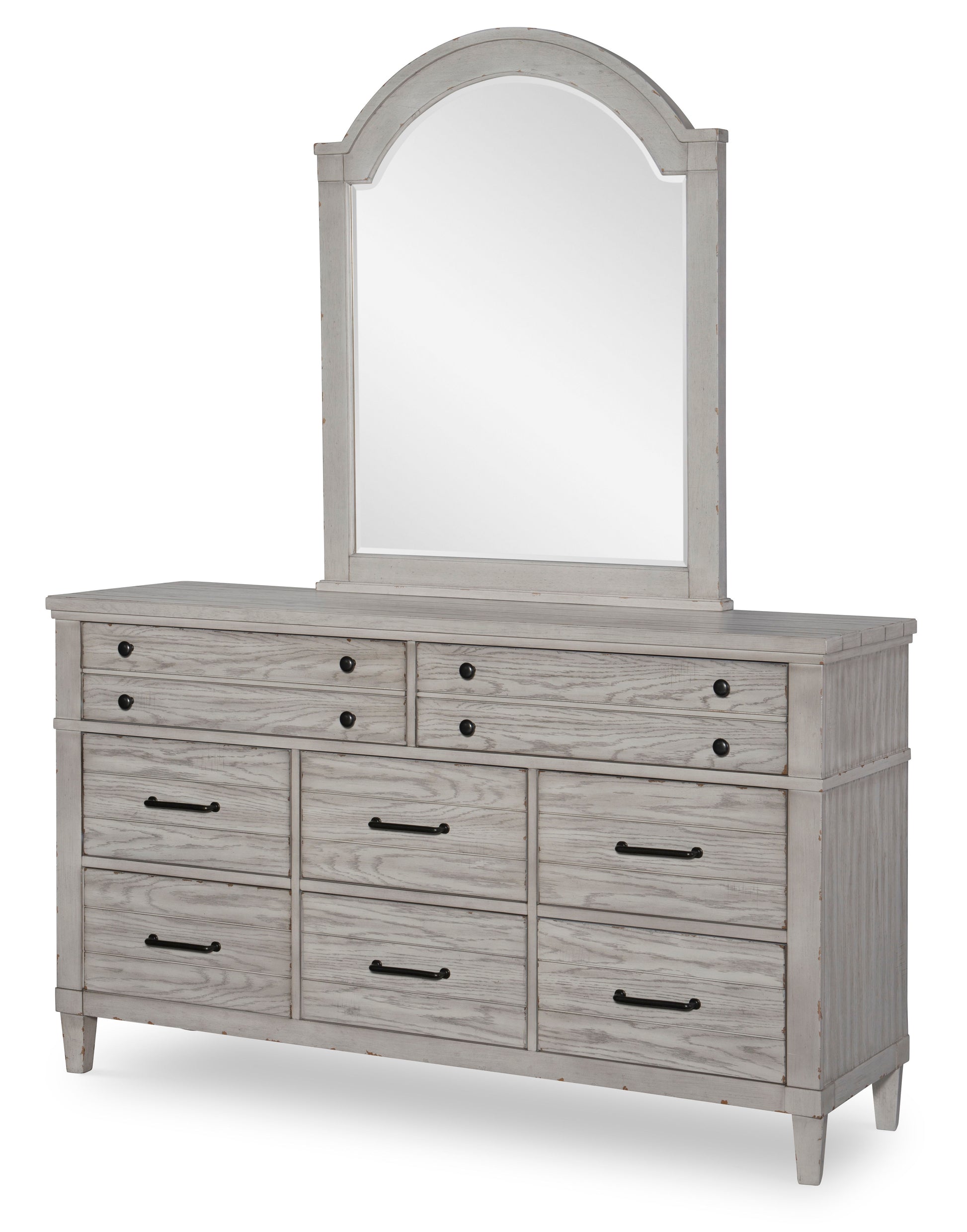 Create an inviting space with the beveled Belhaven Arched Dresser Mirror. With a soft arch, this mirror is a unique design combination of coastal, cottage, and modern farmhouse elements. The weathered plank finish with wire brushing and distressed, worn edges adds a personal touch to this mirror. Pair with the Belhaven Dresser for a look that pops in any room and is sure to fit a myriad of design tastes and styles. Color: Weathered Plank. Material: Rubberwood Solids, Flat Cut White Oak Veneer.
