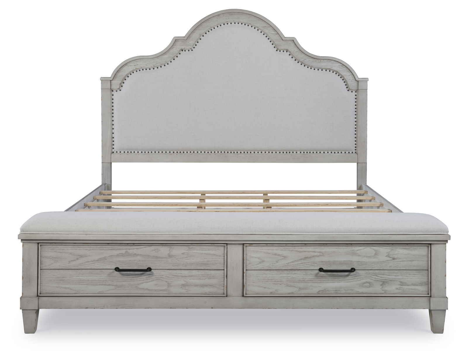 Create an inviting space with lots of character with Belhaven upholstered panel bed. A truly relaxed and welcoming style, the coastal, cottage and modern farmhouse design elements found through out blend well and create a versatile tone. The Weathered Plank finish has a white washed look with wire brushing, distressing and worn edges that all add to the authentic feel. A nailhead trim outlines the upholstered headboard in a graceful arched shape. Tuck blankets away in one of the two cedar-lined footboard drawers that pop with forged iron hardware. The footboard also features an upholstered bench that provides the perfect spot to sit while you lace up your shoes. The Belhaven upholstered storage bed will add style and value to the home for years to come.