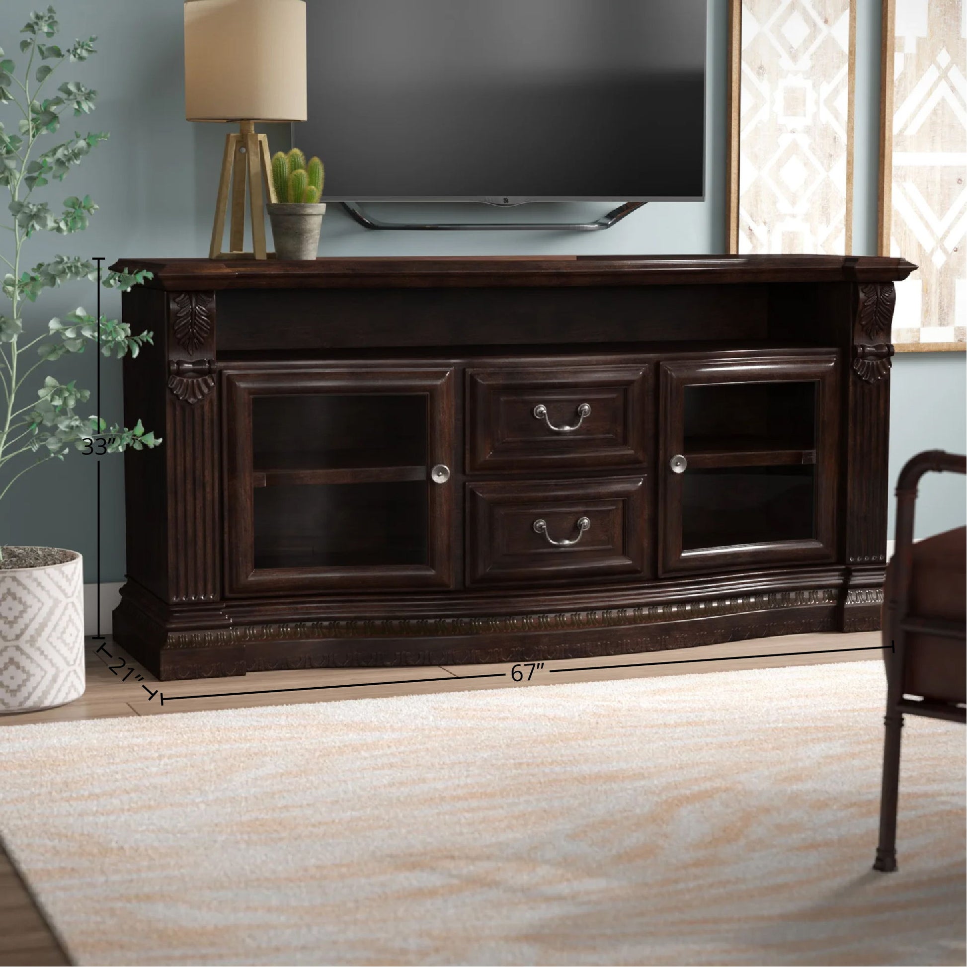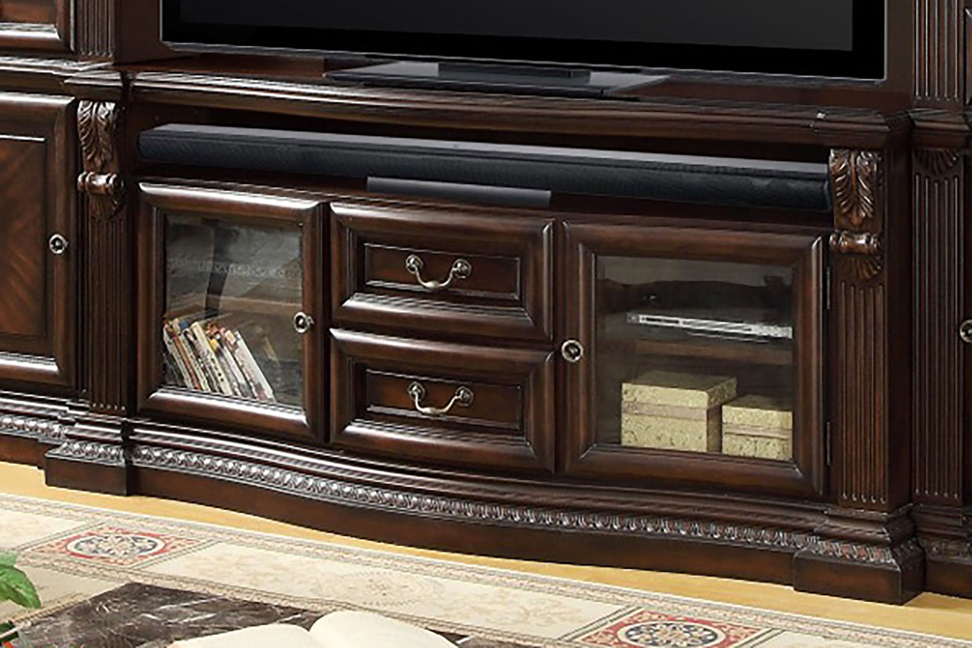 Create a room rich with character by displaying your television on the Bella 67-inch TV Console with power center. The hand-applied wood stain in Vintage Sienna highlights this console's fluted columns, classic lines and carved detailing. Offering generous open and closed storage areas for games, movies and components, this stylish cabinet has it all.