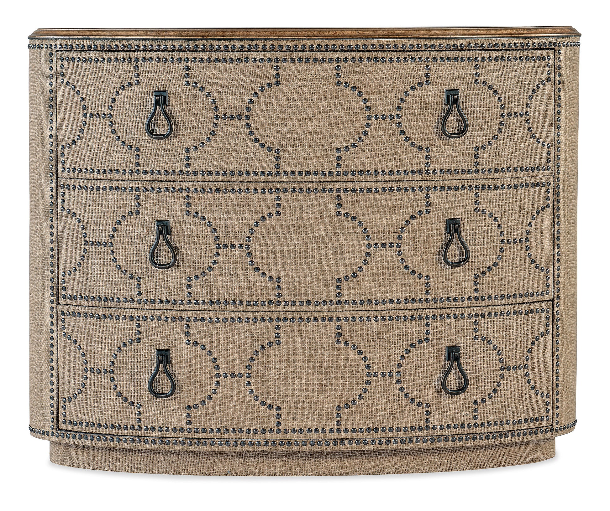Vintage and tactile with a chic flair, the Big Sky Three-Drawer Chest combines a Pecky Hickory Veneer solid-wood-edged top in a Vintage Natural finish revealing the authentic knots and wood grain with a burlap-wrapped case accented by a patterned nailhead design. With three self-closing drawers, the top drawer has a removable felt liner and the bottom drawer is cedar-lined.