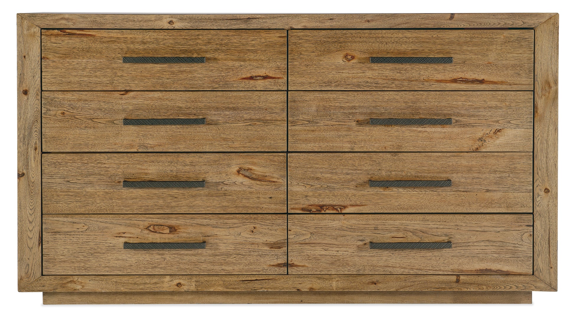 With a clean, simple silhouette, the Big Sky Eight-Drawer Dresser exudes the authenticity of the open spaces of the American wilderness. Crafted of Pecky Hickory Veneers and Cedar with a solid-wood edged top, the dresser is finished in the warm Vintage Natural. The drawers are self-closing and the top left has a removable felt liner, while the top right has a removable liner and felt jewelry tray. Both bottom drawers are cedar-lined.