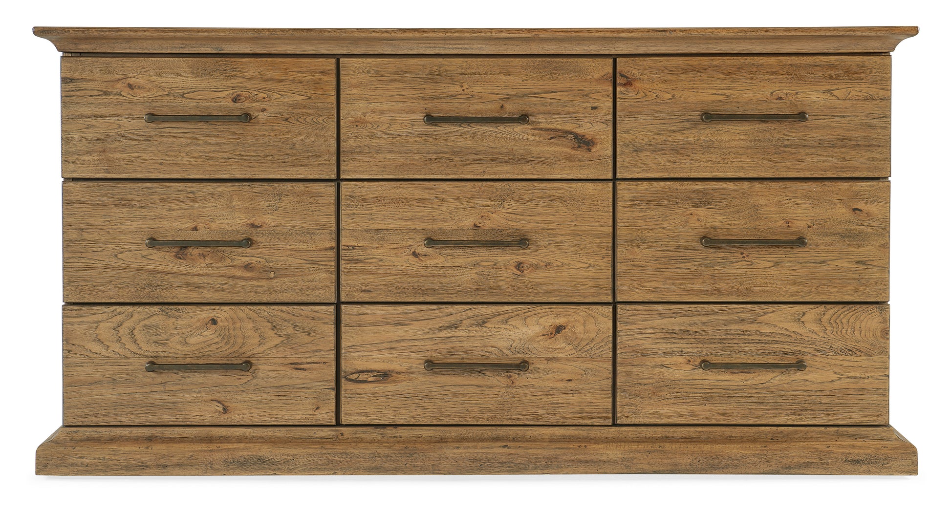 With a clean, simple silhouette, the Big Sky Nine-Drawer Dresser exudes the authenticity of open spaces in the American wilderness. Crafted of Pecky Hickory Veneers and Cedar with a solid-wood edged top and moulding on the base and top, the chest is finished in the warm Vintage Natural. The three top drawers have a removable felt liner and the top right drawer has a removable felt-lined jewelry tray. The 3 bottom drawers are cedar-lined. Dark brushed bronze bar pulls.
