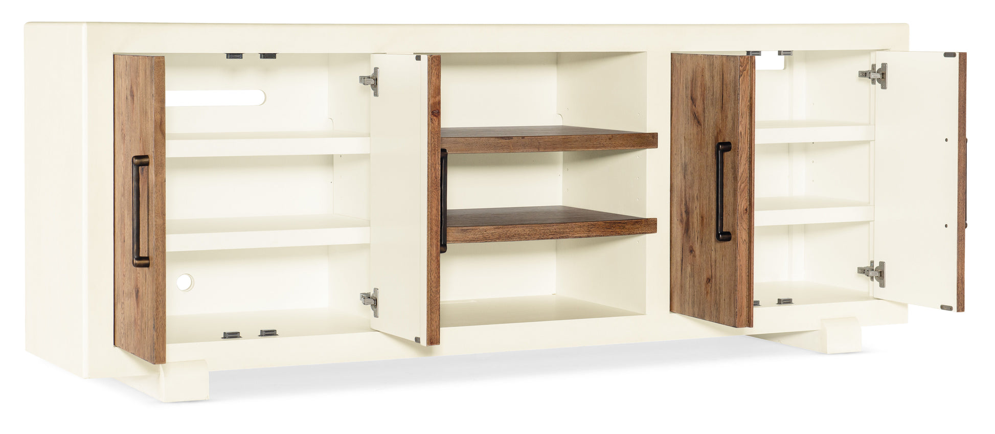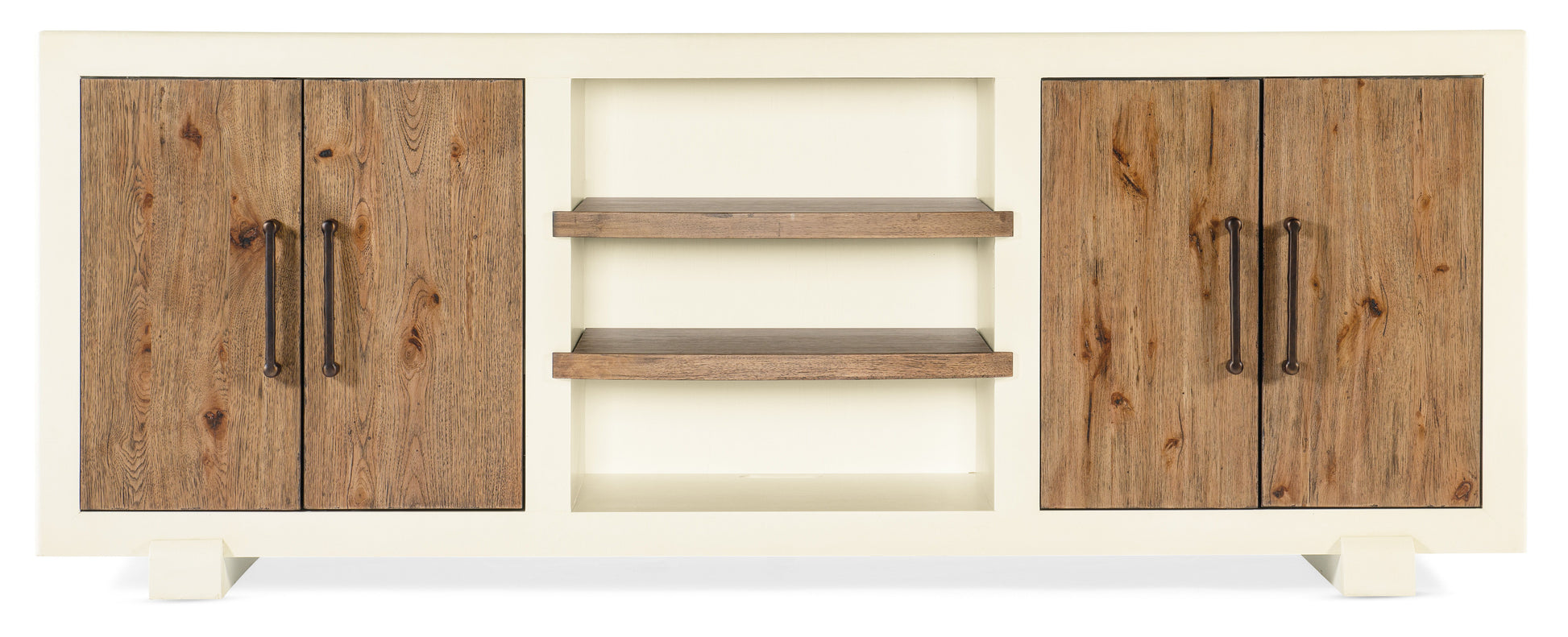 Inspired by the natural beauty of the American wilderness, the Tahoe Entertainment Console features a two-tone finish that marries Avalanche White with Vintage Natural, a warm finish over rustic Hickory Veneers. Avalanche recalls the blankets of snow that feed the streams of rivers of America’s Western landscapes. With 4 doors with soft-close hinges and accented by dark brushed bronze bar pulls, there are two adjustable shelves behind each pair of doors and two adjustable shelves in the center section, along with a ventilated back panel and FC705 3-plug outlet. Accommodates up to an 80-inch TV.