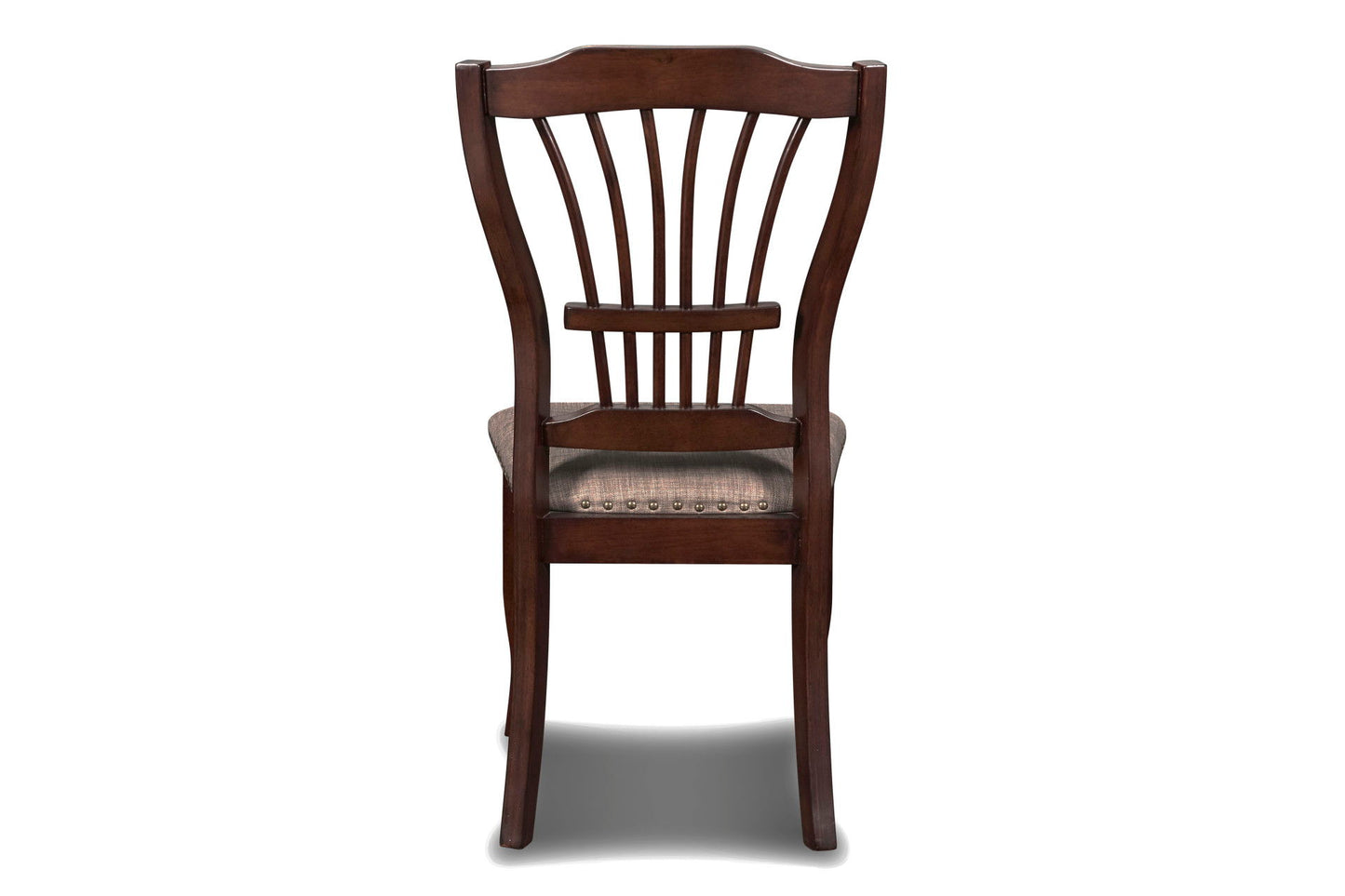 The Bixby Wood Splat Back Dining Chairs, available as a set of two, combine timeless style with lasting durability, making them a perfect addition to both formal and casual dining spaces. Expertly crafted from solid Rubberwood, these chairs are built to endure while showcasing the natural beauty of wood. The rich espresso cherry finish, meticulously hand-applied in a multi-step process, highlights the wood’s grain patterns and adds a subtle, sophisticated sheen. The chairs feature a refined splat back design, with a gracefully curved top rail and artfully fanned vertical slats, enhancing their elegant appeal. For comfort, the high-density foam cushions are covered in easy-care 100% polyester upholstery, ensuring both durability and practicality. Brass nailhead trim adds a touch of classic craftsmanship, making these chairs a stylish and functional choice for any dining setting.