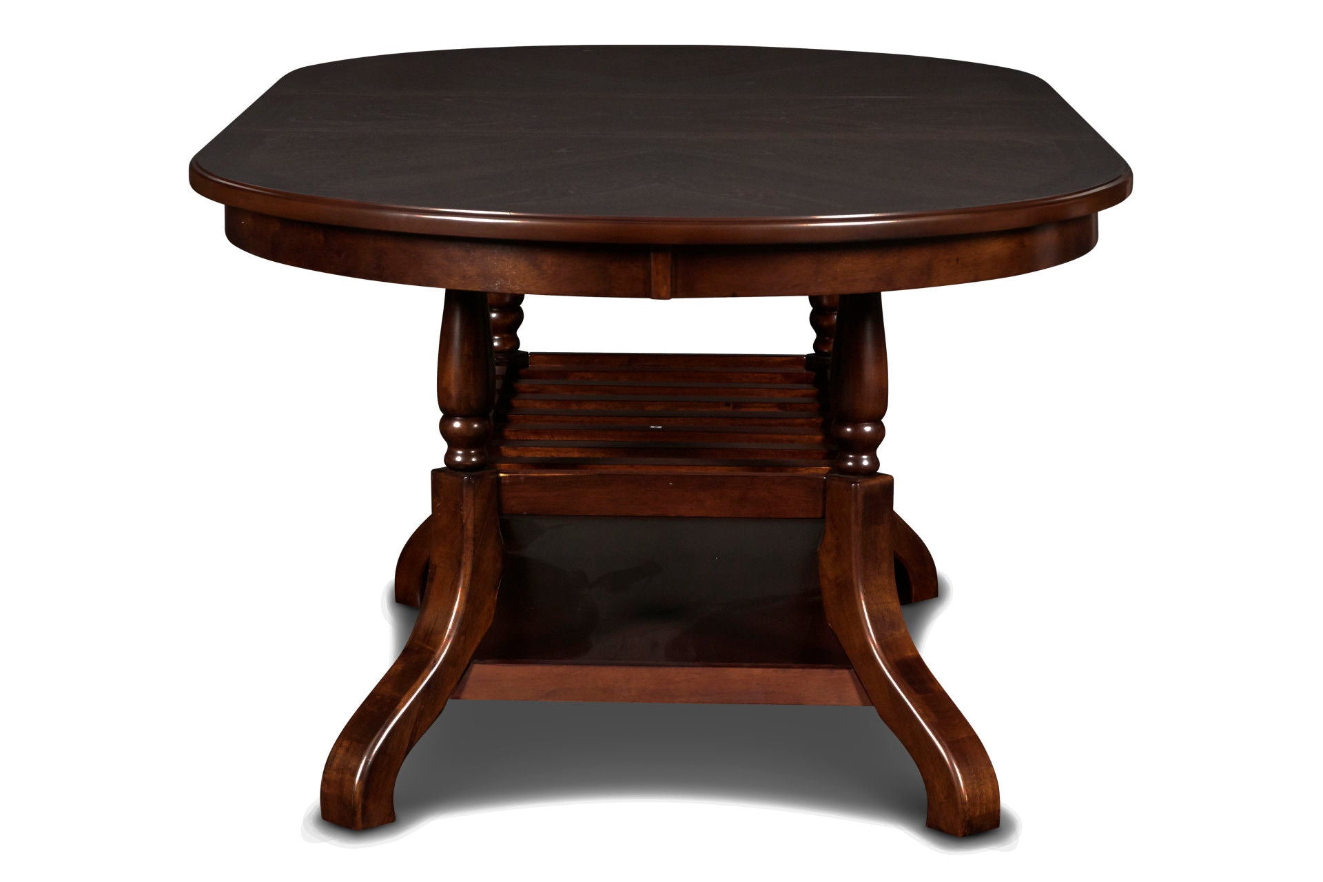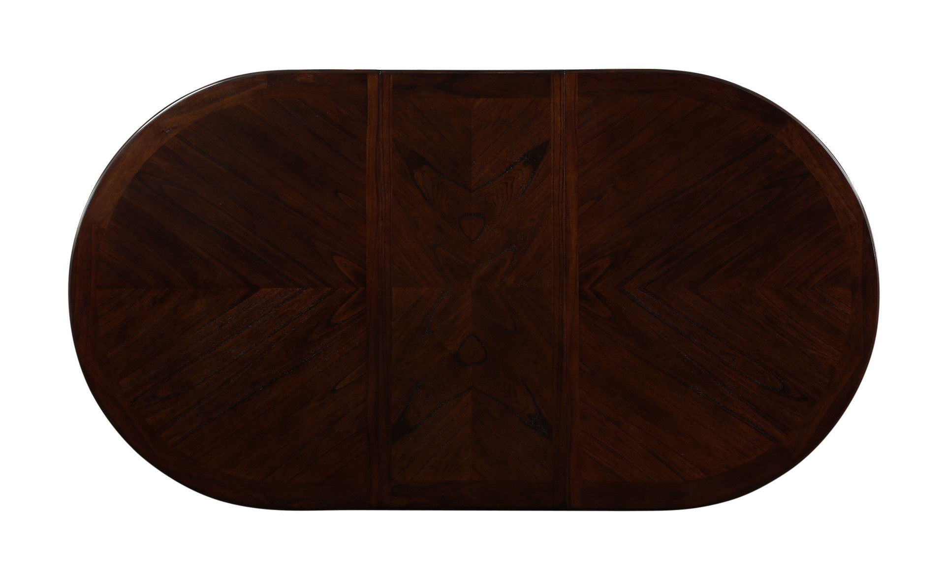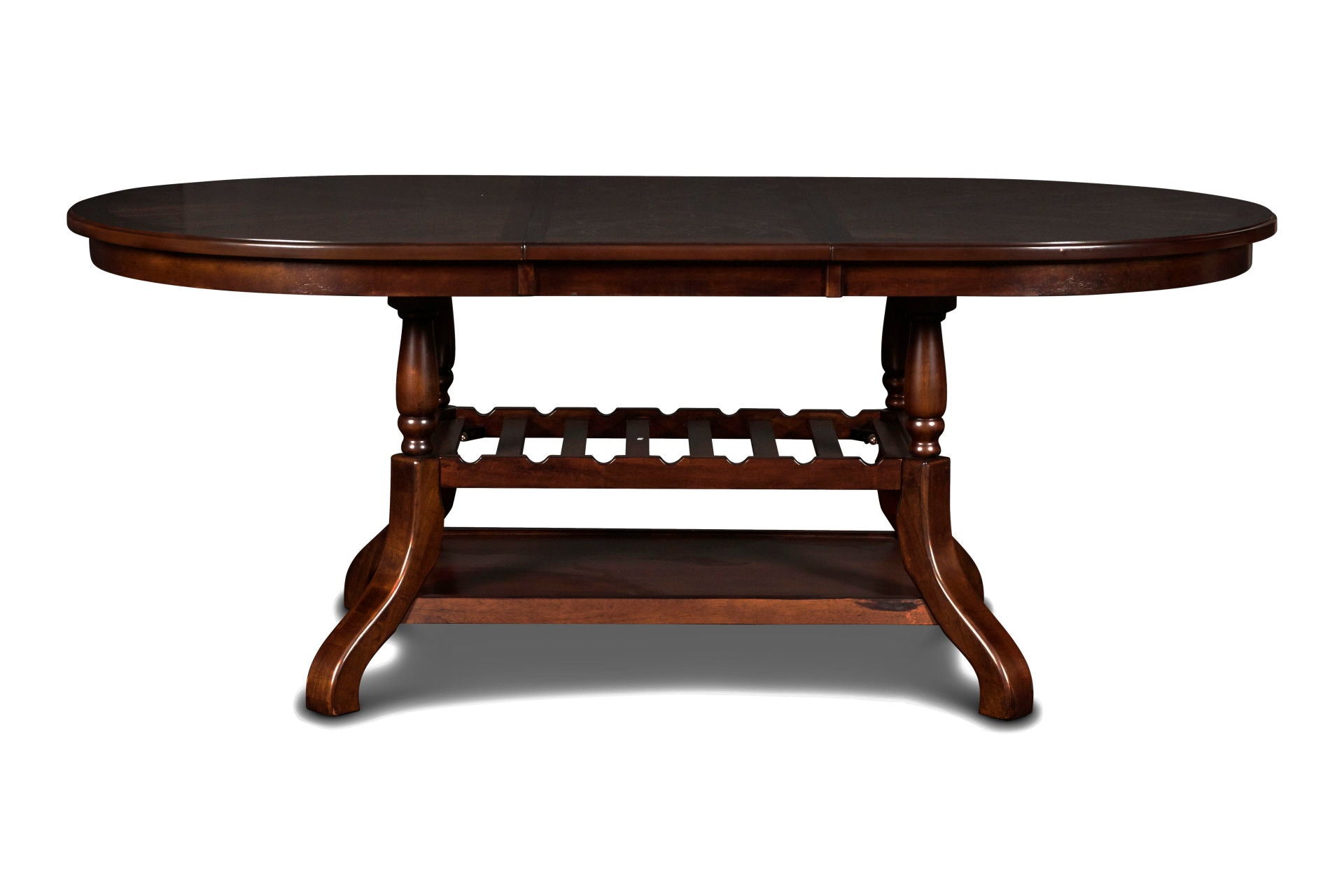 The Bixby Wood Dining Table in Espresso is a sophisticated and versatile piece designed to complement both formal dining rooms and cozy kitchen spaces. Expertly crafted from solid Rubberwood, manufactured woods, and real wood veneers, this table offers exceptional durability while showcasing the natural beauty of wood. The rich espresso cherry finish is meticulously hand-applied in multiple steps, highlighting the wood’s grain and adding a subtle, elegant sheen. The table’s classic oval shape is supported by a sturdy turned pedestal base, exuding traditional charm. Practicality meets elegance with the integrated lower shelf featuring wine storage racks, making this table a functional centerpiece. For versatile dining needs, the table extends from 42" to 60" with the included 18" leaf, comfortably accommodating up to six people. The book matched veneer top adds a distinctive, mirrored pattern that enhances the table's refined aesthetic, making it a striking addition to any dining space.