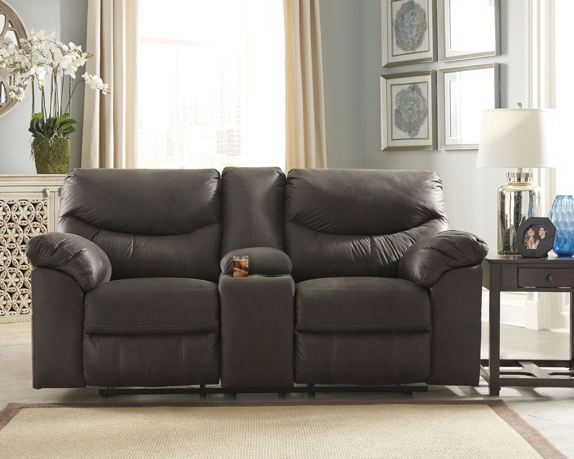 Rock the cool look of leather minus the hefty price tag with this reclining loveseat with console. Rich with tonal variation, the indulgently soft upholstery sure looks like the real thing. And talk about indulgent comfort. Double stuffed armrests and sumptuous cushions cradle and support in all the right places. Distinctive scooped stitching enhances this reclining loveseat's contemporary flair. Cup holders and hidden storage complete the experience.