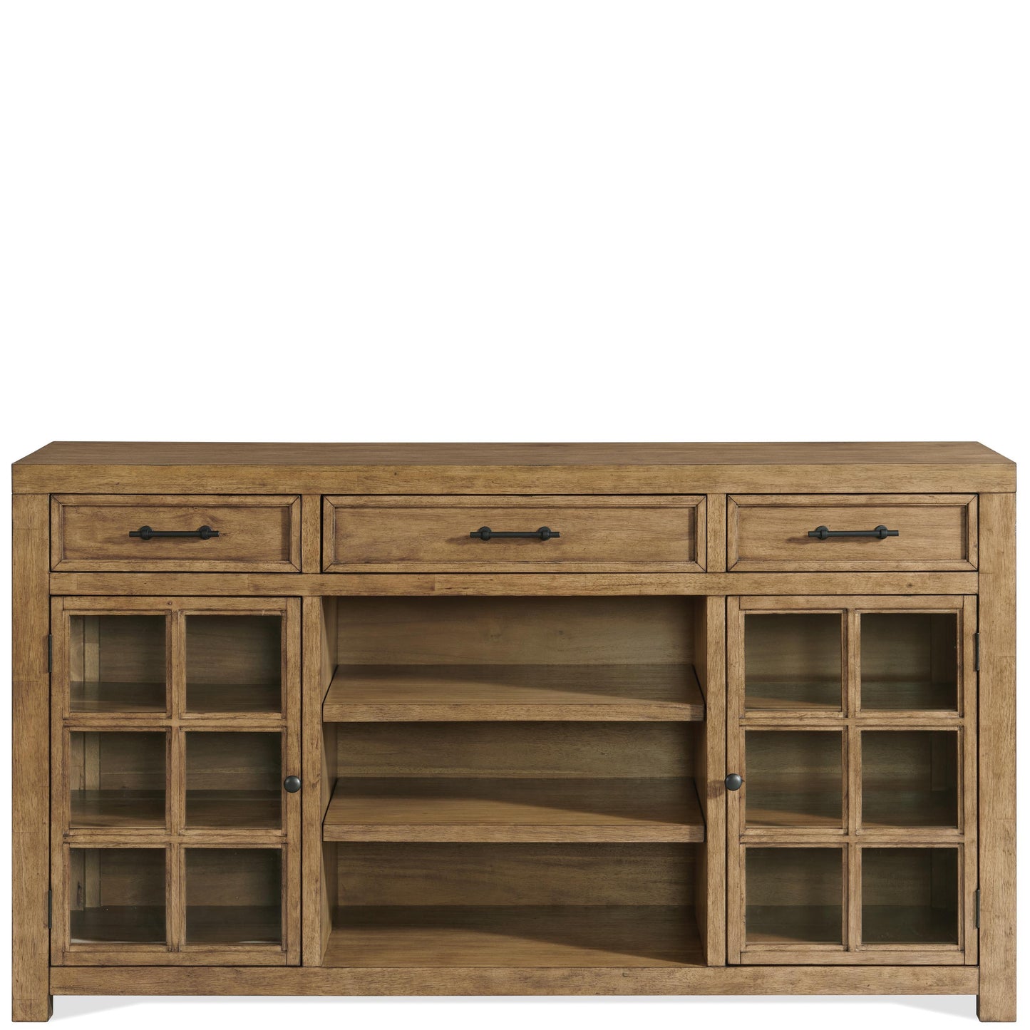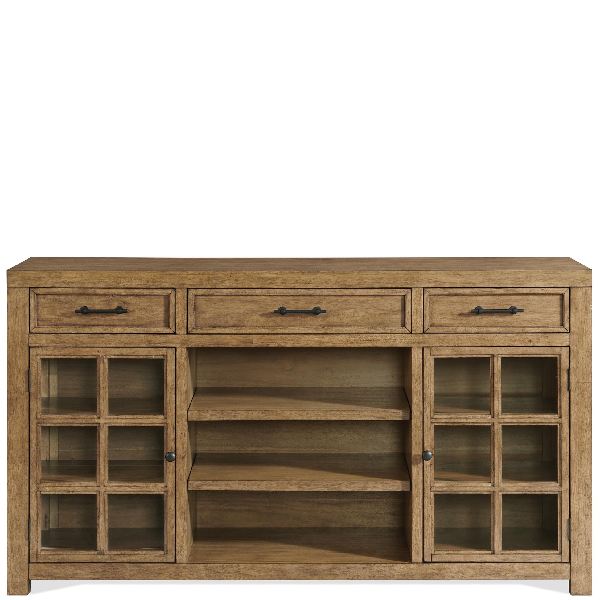 - Three drawers are trimmed with industrial bar pull hardware in a matte black finish