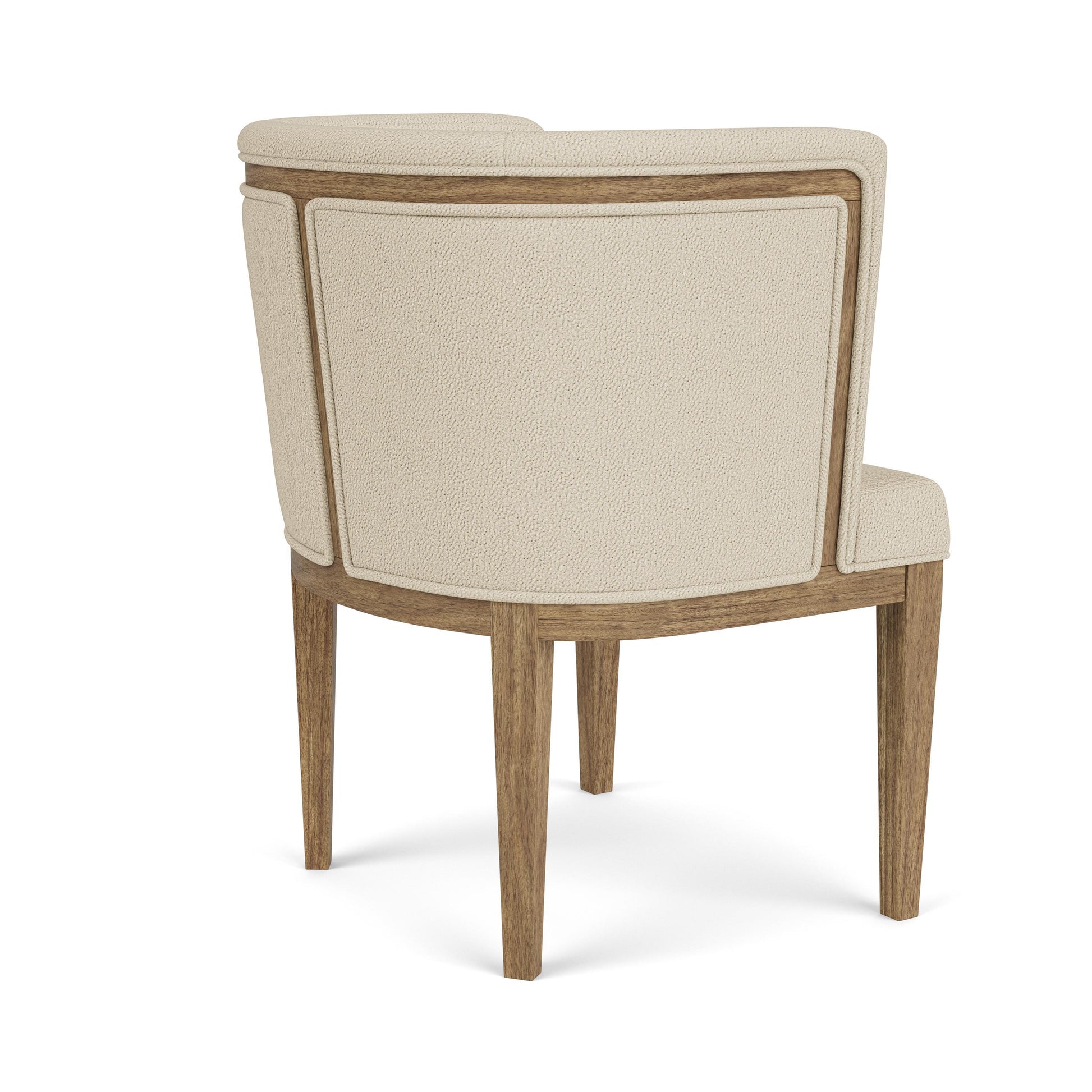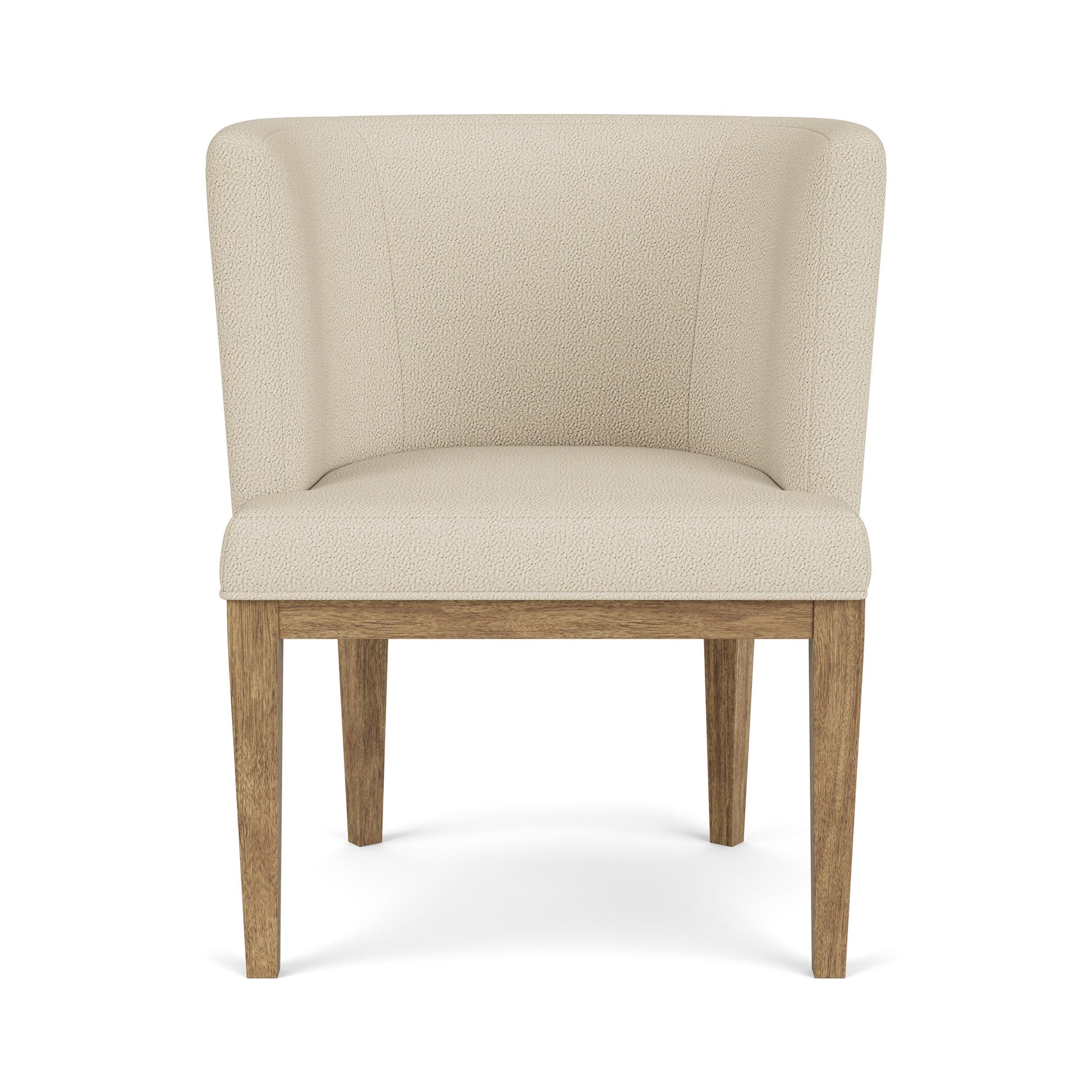 - The round barrel back style chair upholstered in a faux sheepskin fabric adds softness to the dining room