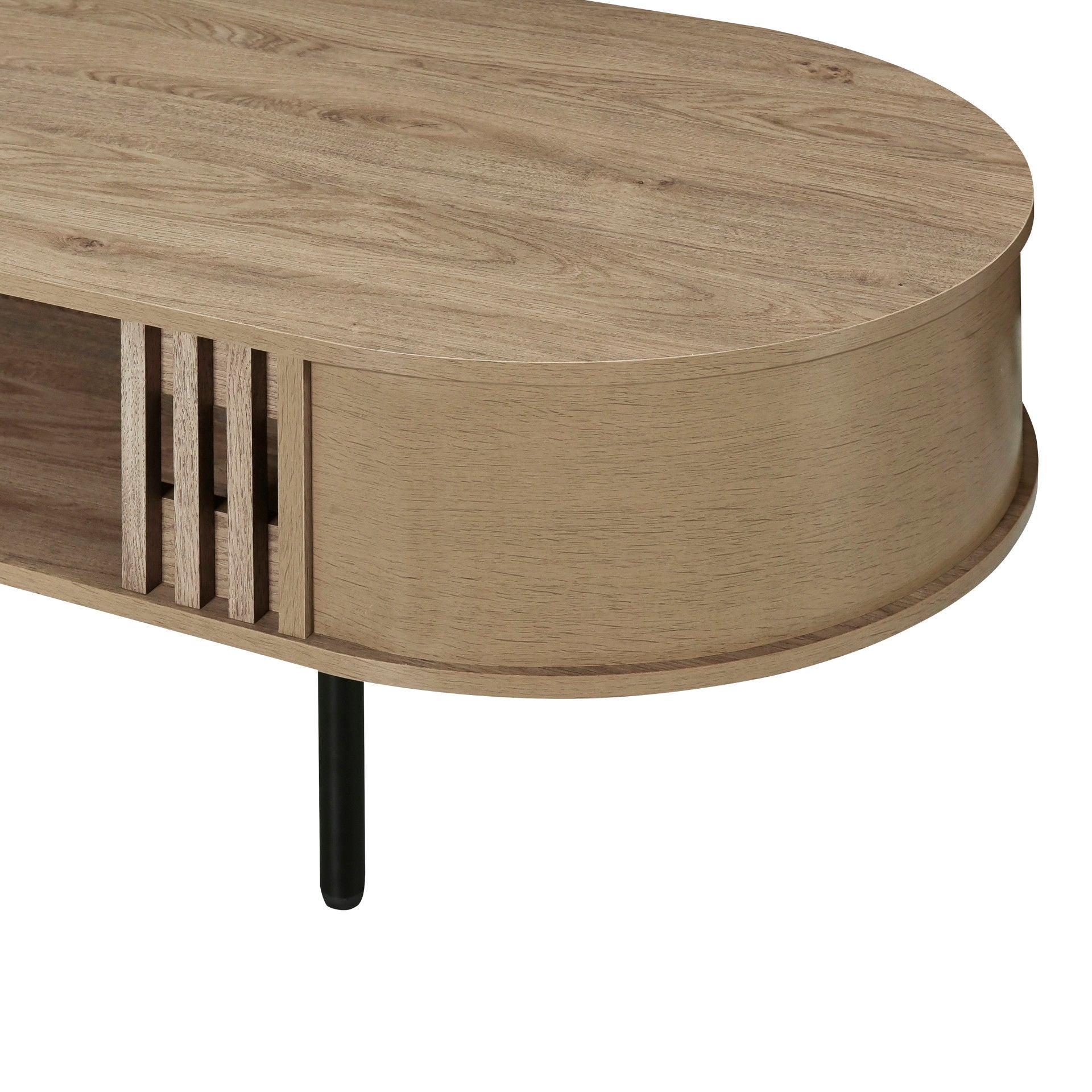 Discover the perfect blend of style and functionality with the Brax Coffee Table/Cocktail Table. This sleek and sustainable table is constructed from manufactured wood covered in durable, environmentally friendly decorative laminate. The 47" table offers ample top surface area for drinks and decoration, while the lower storage shelf is perfect for keeping reading materials, remotes, and more within easy reach. The black metal legs and rounded edges add a contemporary touch, while tambor style moldings add character and distinction. The light, natural beige finish complements a variety of décors, making this table a versatile addition to any living space.