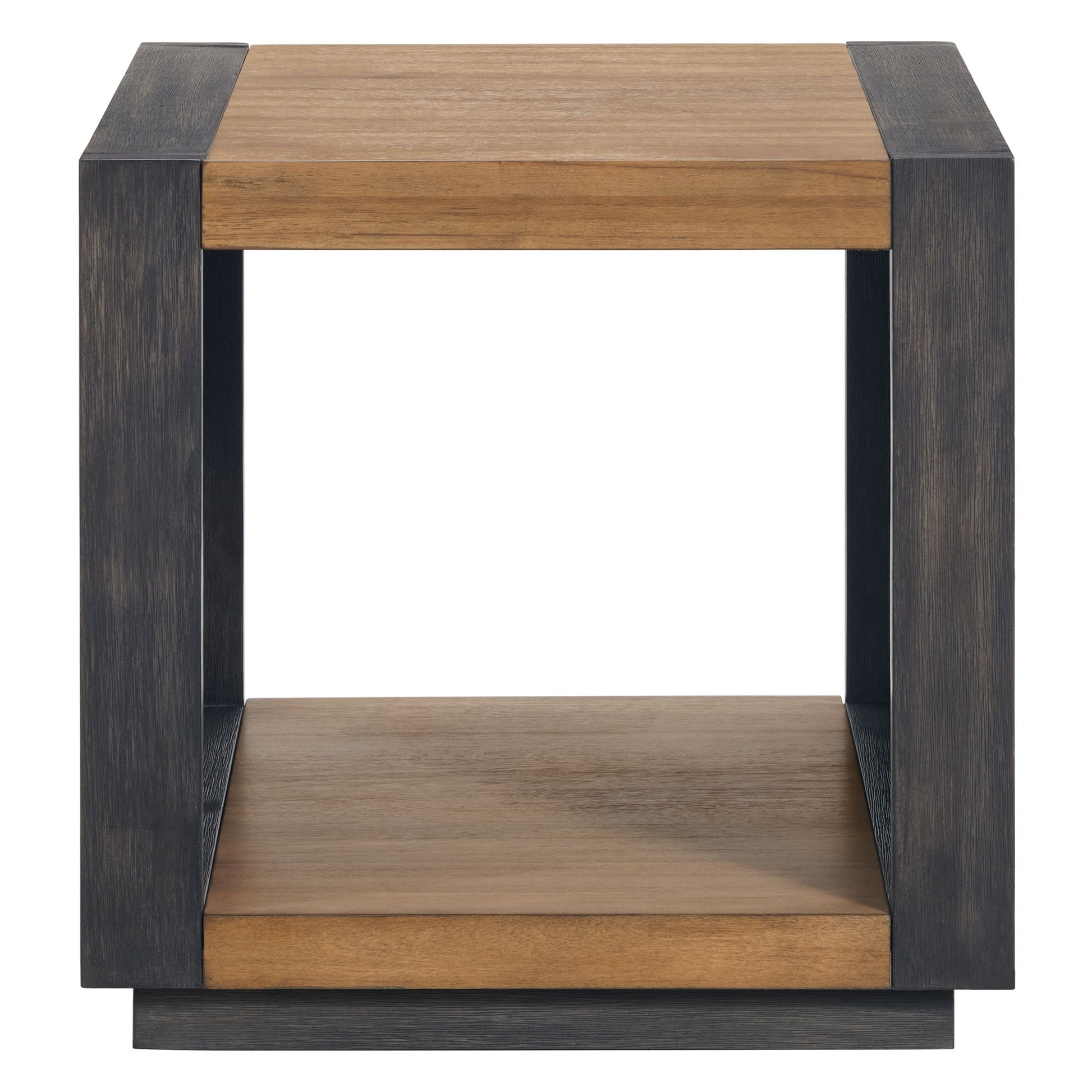 Introducing the Breckenridge End Table, showcasing sleek Scandinavian design with its two-tone finish of light oak and black wood grain. This contemporary piece features an open middle storage shelf for displaying your favorite items, while its minimalistic style is enhanced by the absence of hardware. With its clean lines and modern aesthetic, this end table seamlessly blends into any room decor.