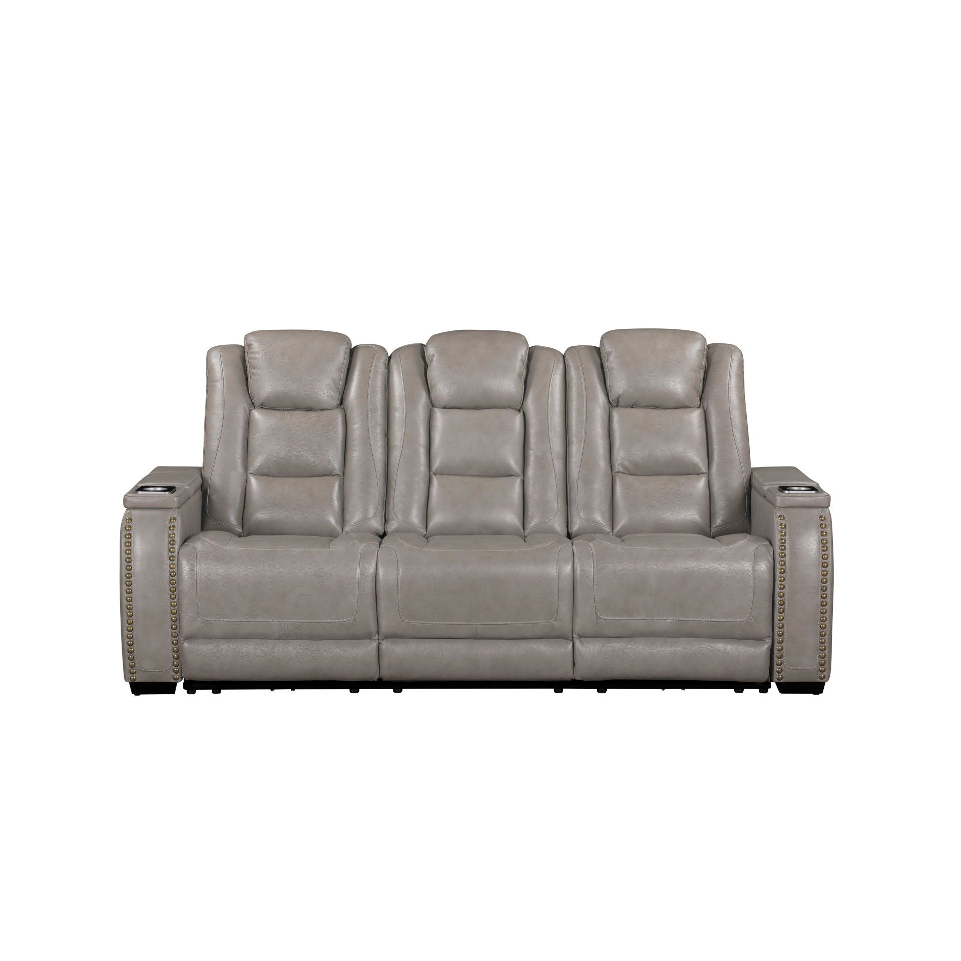 The Breckenridge Genuine Leather Power Reclining Sofa with Adjustable Headrests in Gray offers a blend of luxury, durability, and modern convenience, perfect for any living space. This sofa is crafted with a combination of hardwood and manufactured woods, ensuring a sturdy and durable frame that provides long-lasting support. The top-grain leather on high-contact areas like the seats, arms, and footrests delivers a luxurious feel, while the use of a matching synthetic leather in less-touched areas keeps it more economical without compromising on style or comfort. The design features clean lines and elegant nailhead trim, seamlessly blending traditional and contemporary elements for a refined, transitional look. Pocket coil seat cushions offer superior comfort with targeted support, reducing pressure points for a more tailored seating experience. The power recliner and adjustable headrests allow you to effortlessly find your perfect position for lounging or reading with just the touch of a button. This sofa is also packed with convenient features, including built-in wireless chargers, generous storage compartments, and cupholders integrated into the armrests. Additionally, it includes a drop-down tray, electrical outlets, and reading lights, allowing you to unwind, stay connected, and enjoy your favorite activities without ever leaving your seat.