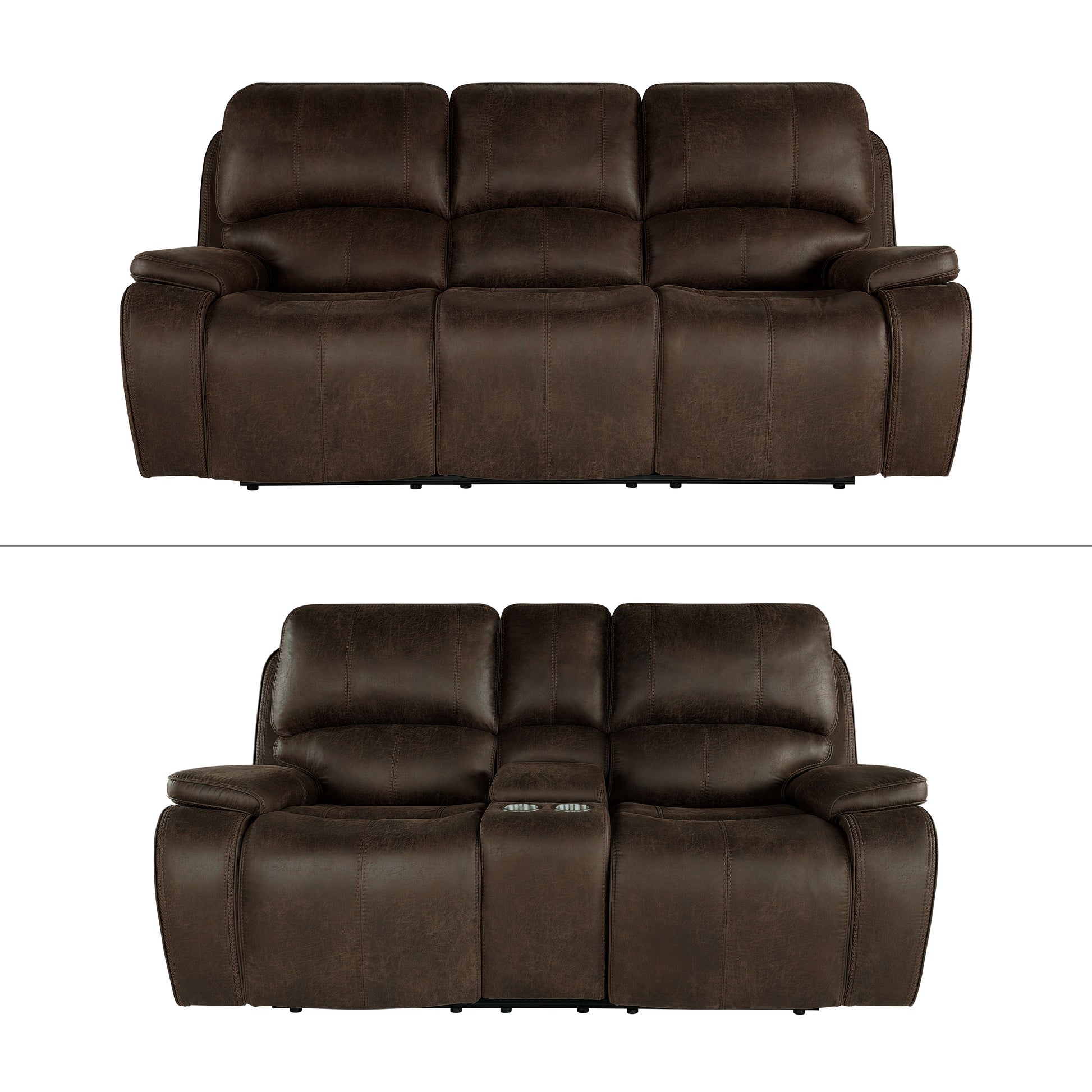The Brookings Reclining Sofa Set is a perfect blend of style and comfort for your living room. Upholstered in soft hand polyester/PU fabric that mimics the look of real leather without the hefty price. The pillowed arms, double-stitched racetrack arms, bucket seats, and plush backrests, all featuring distinctive baseball contrast stitching, create a standout style statement. Enjoy the ultimate comfort with fully upholstered chaise recliner footrests. The sturdy construction of hardwood and manufactured wood frames, coupled with coil spring cushions wrapped in resilient foam and polyester, ensures durability and long-lasting support. The no-sag seat suspension further enhances comfort. For added convenience, the loveseat''s center console offers handy storage for remote controls and built-in cupholders for your beverages. The Brookings set’s leather-look upholstery and neat tailoring lend a comfortable, lived-in ambiance to your home. Experience unparalleled comfort and practicality, making this a must-have addition to your living space.