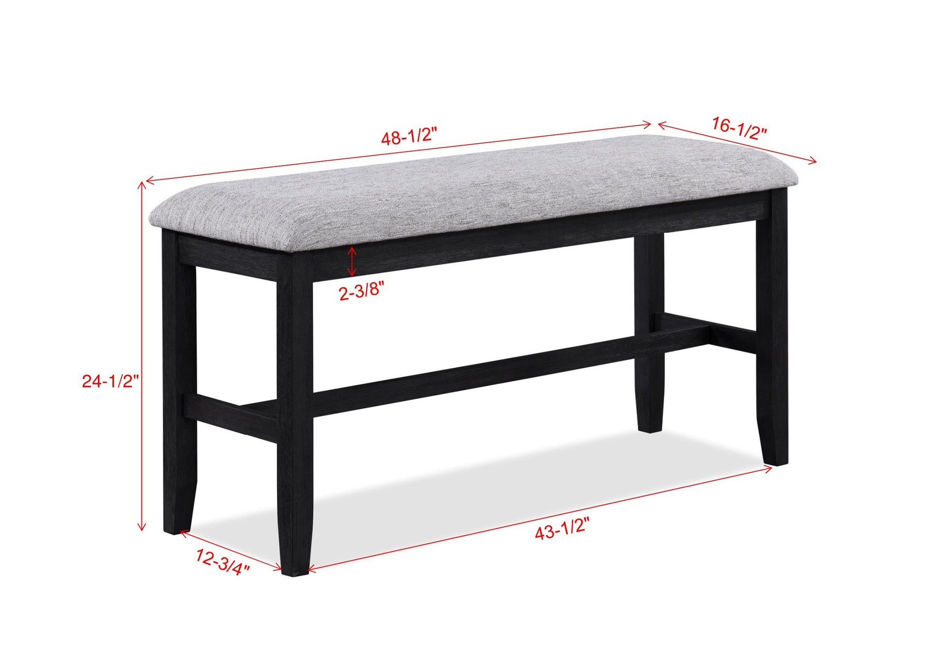 Experience the fusion of contemporary flair with classic comfort in this sleek dining ensemble. Boasting a deep charcoal finish with striking wood grain detail, this set is an emblem of modern sophistication. The plush, light-gray cushioned seating offers a delightful contrast, ensuring every meal is seated in luxury. A versatile bench inclusion not only maximizes seating capacity but adds a touch of informal elegance.