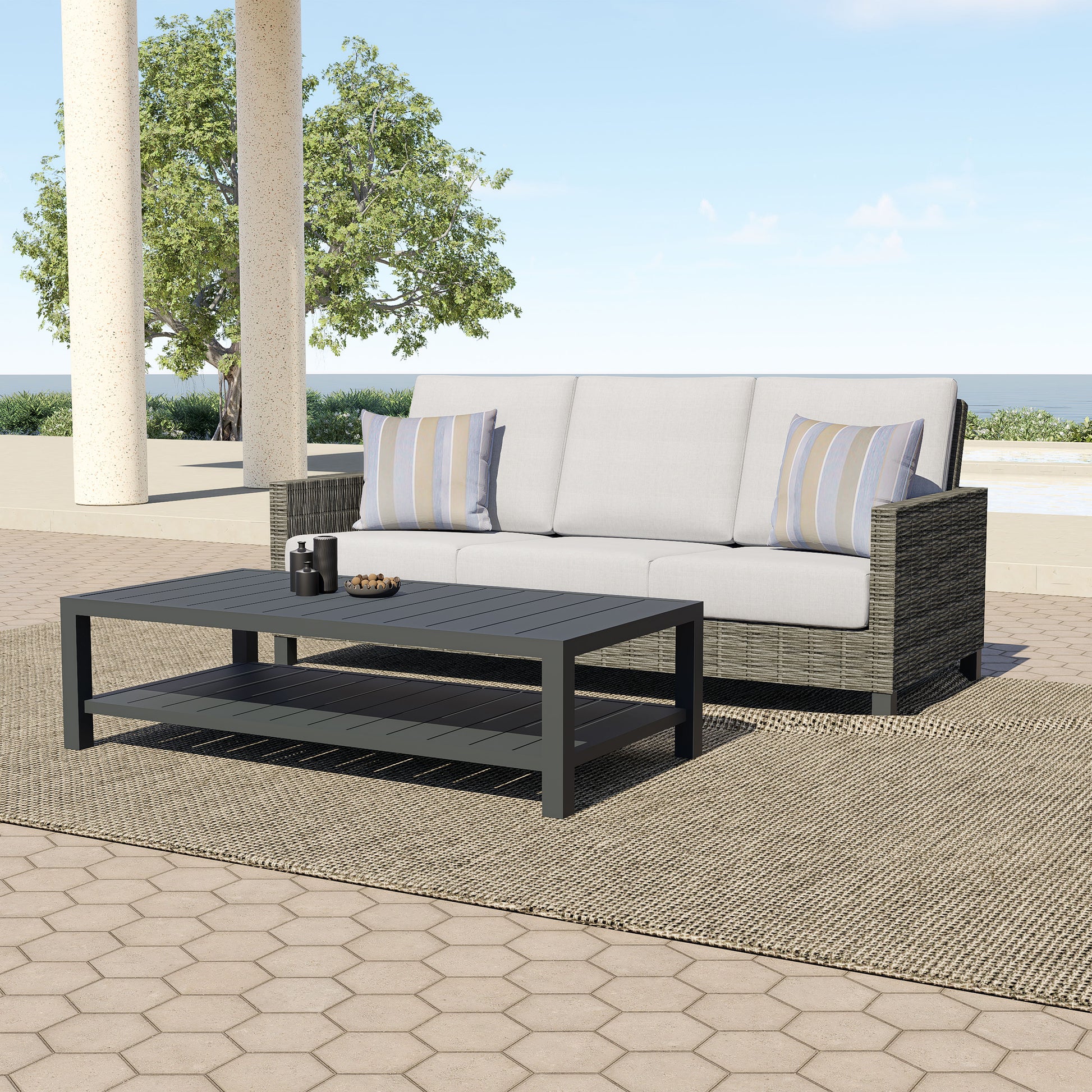 The Bungalow Outdoor Patio Set, featuring a sleek patio sofa and matching coffee table, offers the perfect blend of durability, comfort, and modern style for any outdoor space. Built with durable aluminum frames and a baked-on powder coat finish, this set provides superior scratch resistance and long-lasting performance. The furniture is wrapped in high-density PE wicker, an eco-friendly synthetic resin that captures the classic look of wicker while offering low-maintenance care and exceptional resistance to water, mildew, and fading. Designed for all-weather durability, the sofa features plush, high-density 12cm foam seat and back cushions upholstered in premium Sundura™ fabric—a solution-dyed 100% polyester that resists fading, mildew, and moisture to keep the set vibrant and fresh season after season. The set’s modern design showcases clean lines and a versatile neutral color palette, making it a stylish addition to any outdoor décor. The slatted coffee table adds a classic touch while promoting water drainage for added practicality. This set is designed to provide lasting comfort and contemporary elegance for all your outdoor gatherings.