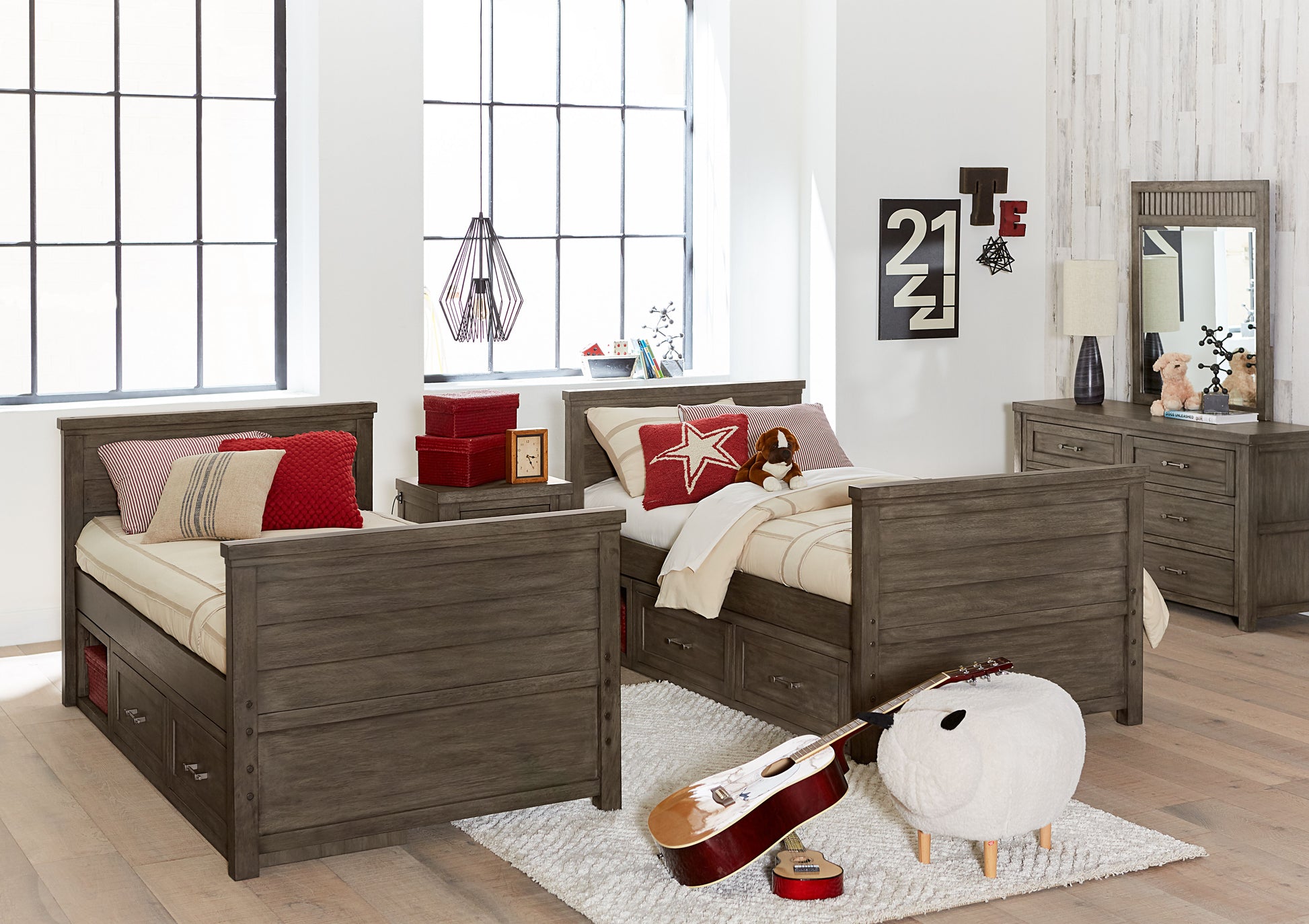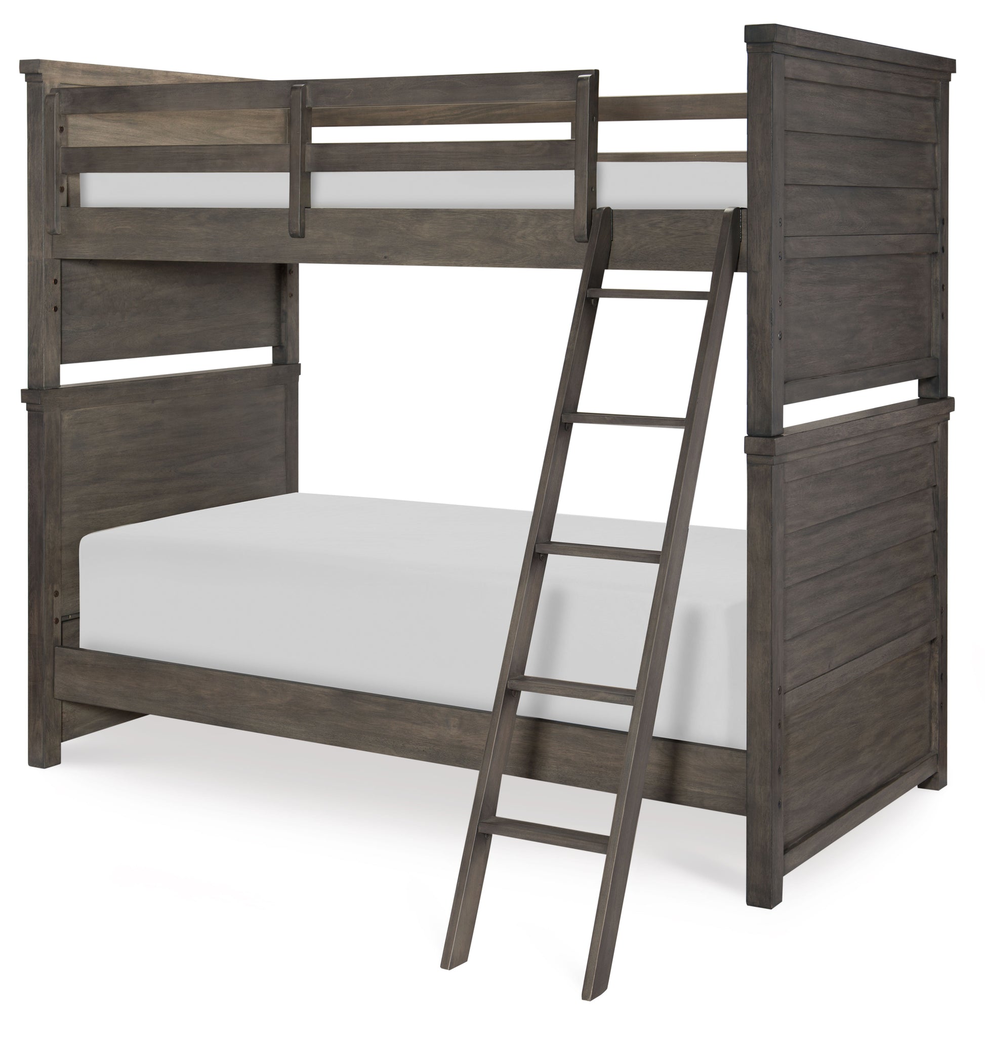 With clean lines and a rustic casual look, Bunkhouse is sure to pop in your home. Crafted with select hardwoods and acacia veneers, the complete Bunk Bed is a stunning and versatile addition to this collection. Horizontal panels on the headboard and footboard in an aged barnwood finish provide a unique and organic farmhouse look. The Bunk Bed embodies the natural feel of this strong collection and can be incorporated into any room’s style and color, creating a peaceful sleeping space. Add the Bunkhouse 8830-9300 Underbed Storage Unit for added stowing space, or the 8830-9500 Trundle/Storage Drawer for use as an extra bed. The Bunk Bed requires a ladder but for room planning.