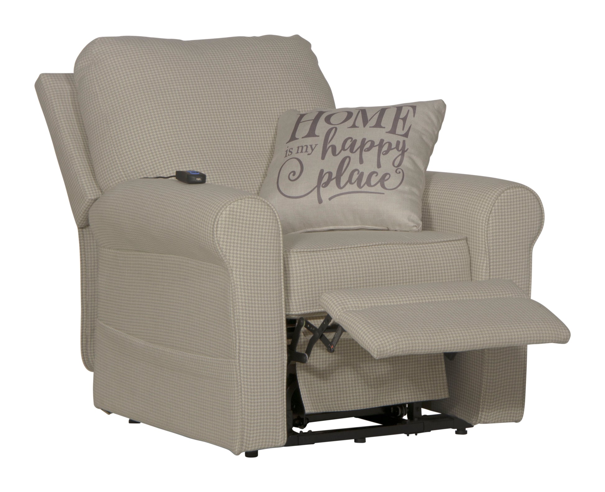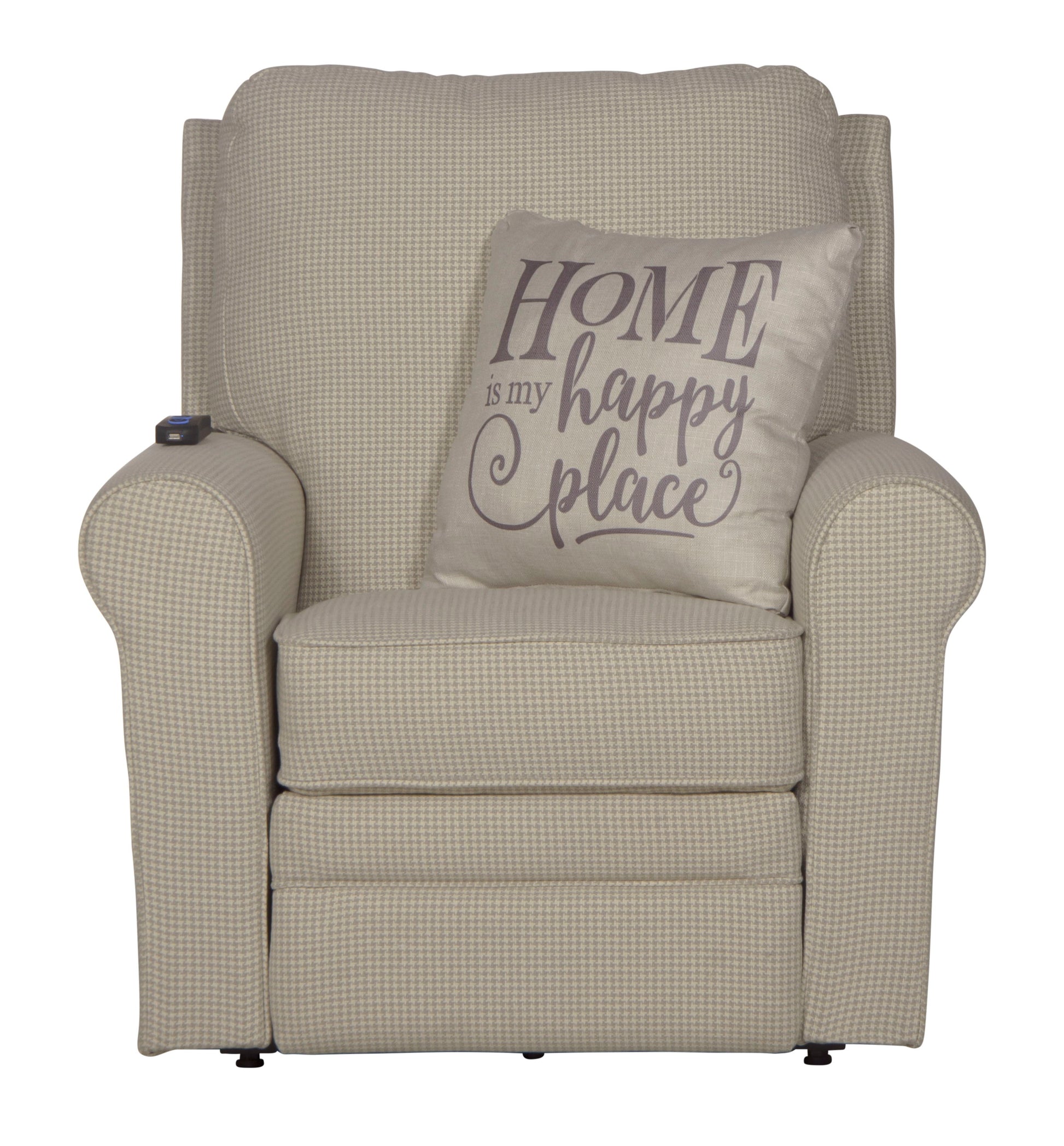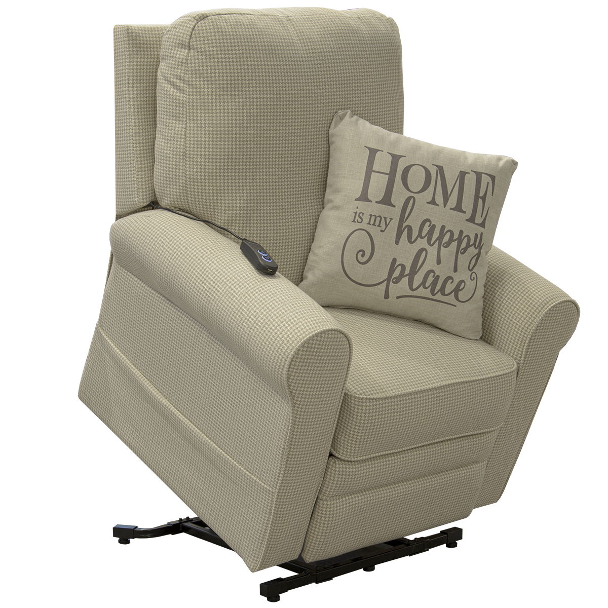 Our Capetown Pow'r Lift Chair features a sock arm with firm top for support. This transitional design features a decorative "Home is my Happy Place" emoji pillow.