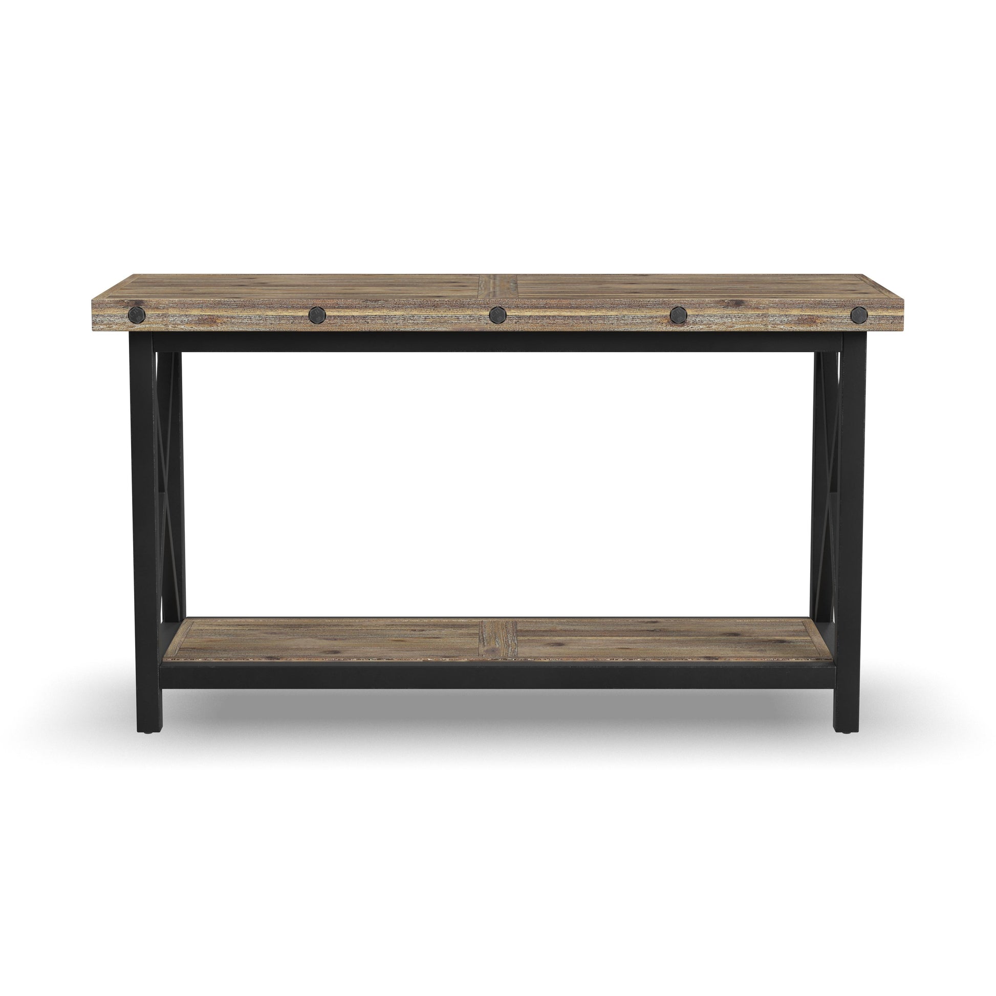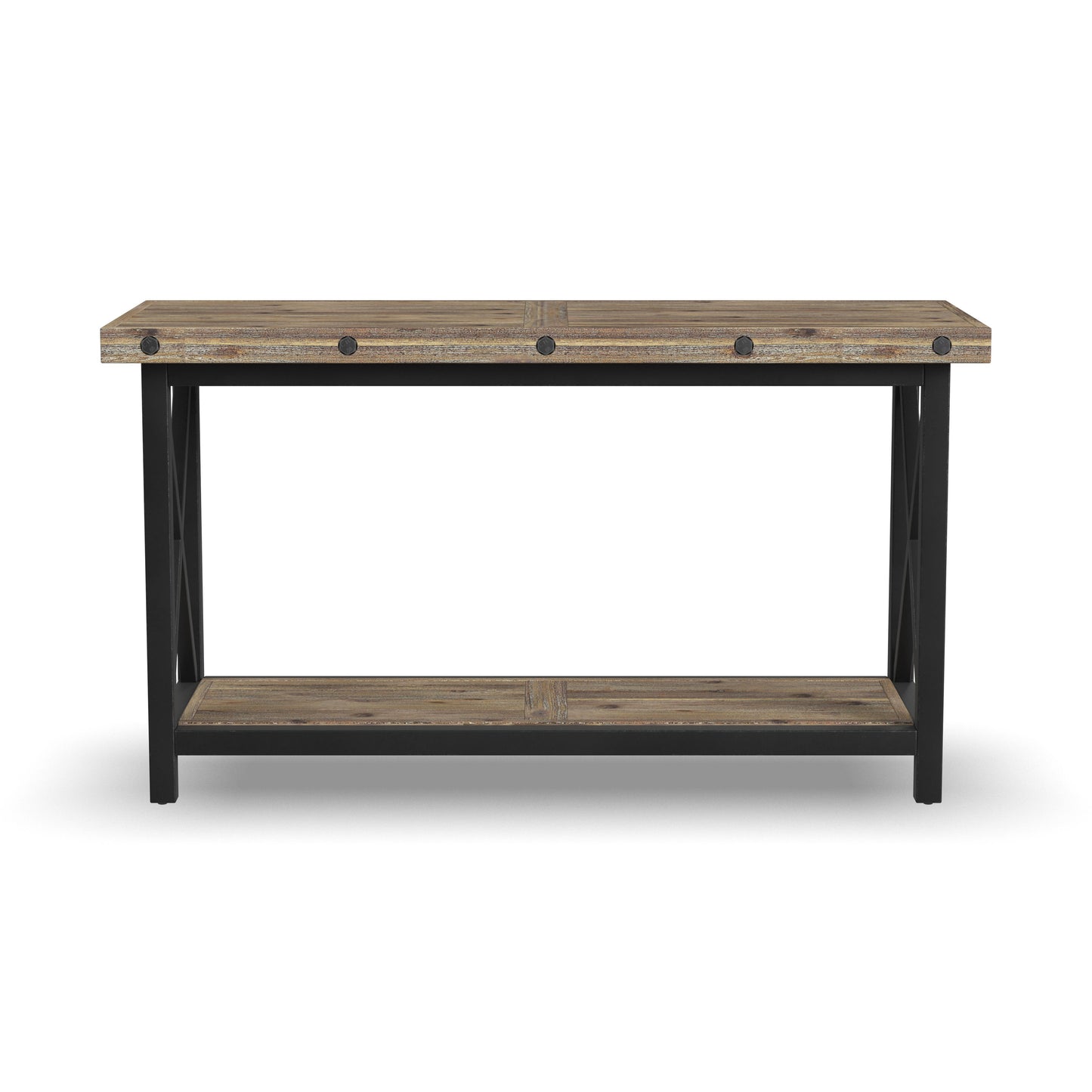 Industrial construction inspired by vintage workbench design. Drawing inspiration from vintage workbenches, the Carpenter sofa table is constructed of solid wood planks, distressed for a reclaimed look, and hand-worked metal frames. Exposed bolt heads underscore the aged, oiled finish that resembles an industrial steel framework. Whether placed behind a sofa or against a well, this table adds character and personality to any room.