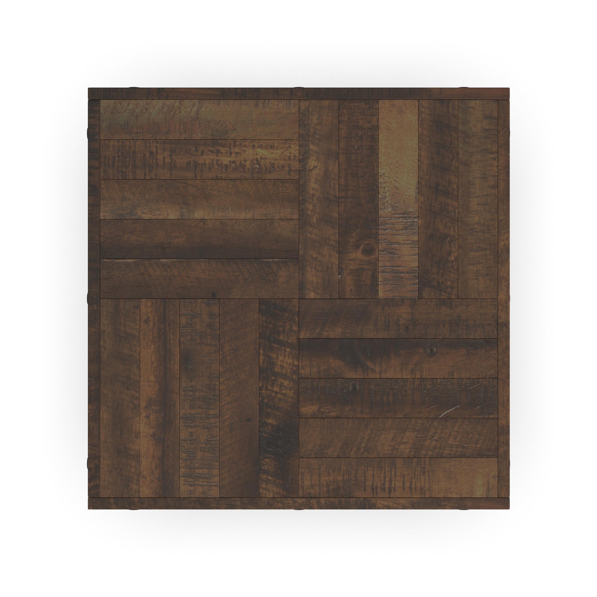 Industrial construction inspired by vintage workbench design. Drawing inspiration from vintage workbenches, the Carpenter lamp table is constructed of solid wood planks, distressed for a reclaimed look, and hand-worked metal frames. Exposed bolt heads underscore the aged, oiled finish that resembles an industrial steel framework. This lamp table adds character and personality to any room.