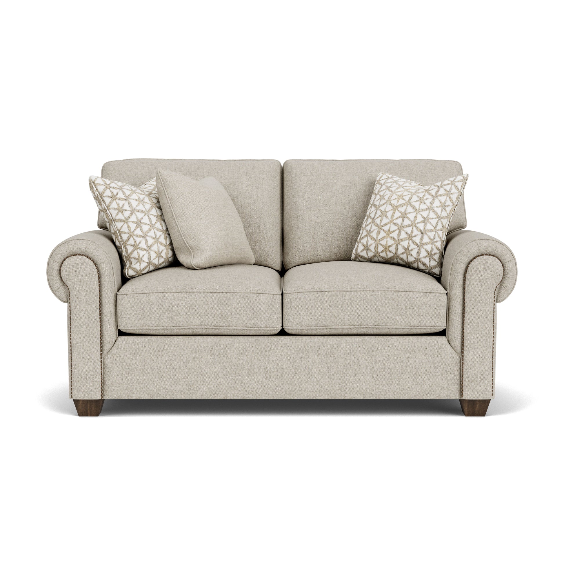 Dramatic characteristics on a bold frame. A unique wrap-around padded armrest on Carsons large-scale rolled arm is highlighted with pleats and welt cording. Optional nailhead trim tightly spaced lines the exposed arm fronts for a fun, visual effect. Relax into Carsons overstuffed seat and back cushions after a long day and feel the stress melt away.