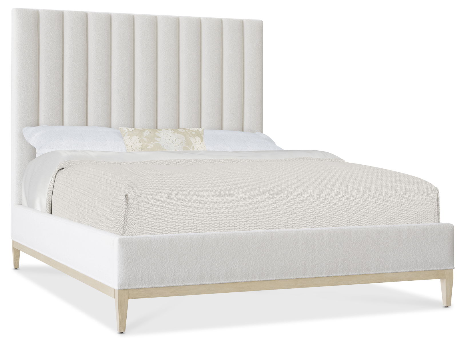 Create a serene and stylish bedroom retreat with the Cascade Upholstered Bed. Upholstered in soft, durable fabric, this bed offers a channeled fabric headboard and a wood base with tapered legs, bringing a modern, transitional feel to any space. The bed’s finish on oak veneers, accented by subtle distressing, adds texture and tranquility. Its clean lines and neutral palette make it a versatile choice for a range of interior styles. Includes headboard, footboard, and rails for a cohesive look.
