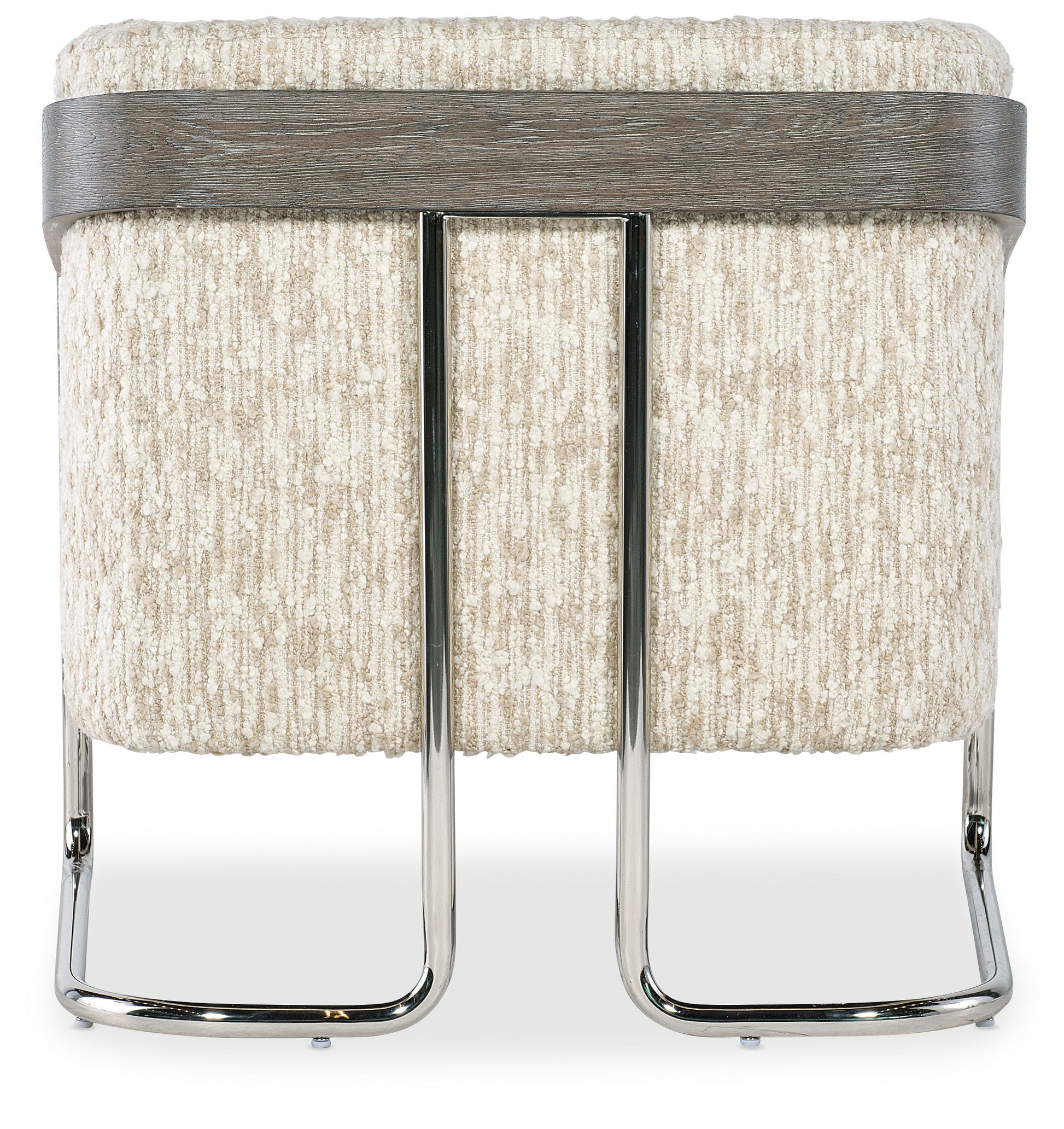 Enhance your living room with the Cody Chair from Hooker Upholstery. This arm chair blends transitional style with comfort, featuring a modern barrel back design and chic topstitch trim. Crafted from quality materials including a chrome metal frame and plush upholstery in Fluffy Natural fabric, it offers both style and durability. Perfect for those seeking a sophisticated addition to their home.