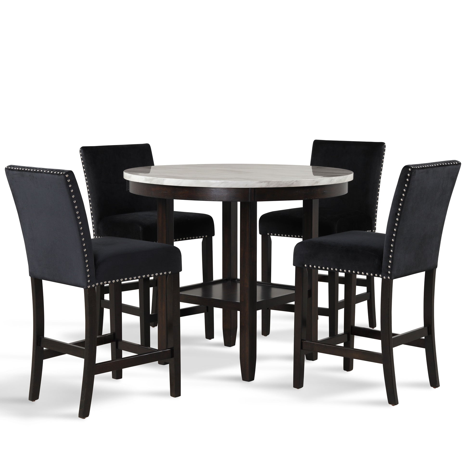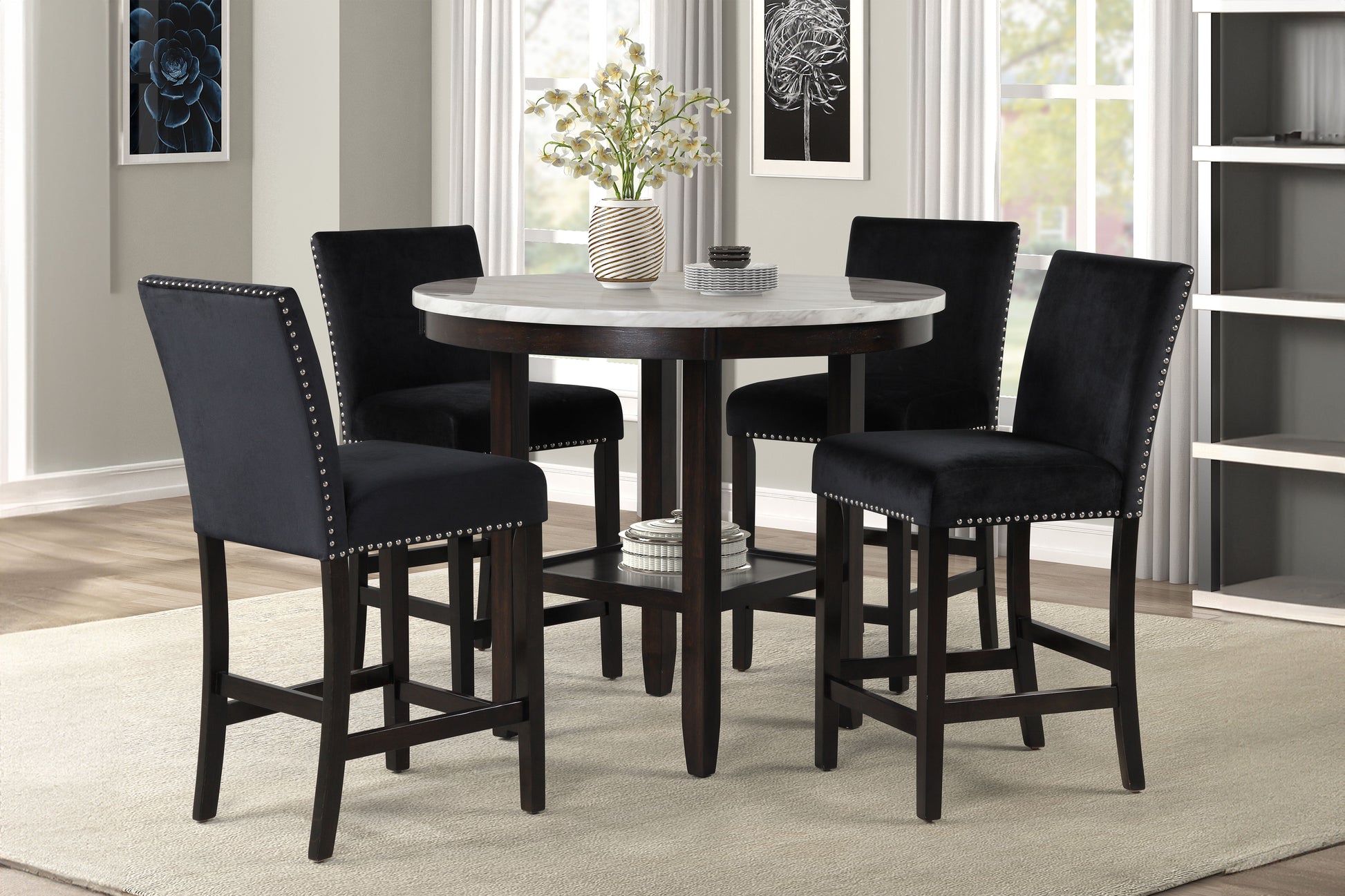The Celeste Counter Dining Set is an exquisite combination of modern sophistication and enduring craftsmanship. This set includes a chic 42-inch counter table with a base and a faux marble top, accompanied by stunning velvet chairs. Crafted from solid Rubberwood and high-quality manufactured wood components, the dining set is designed for longevity, ensuring a lasting addition to your dining space. The glossy finish on the tabletop provides both heat and water resistance, ensuring easy cleaning and protection from wear. The white and gray veined faux marble top, complemented by deep espresso legs, creates a contemporary and glamorous ambiance. Luxurious seating awaits with the soft and durable 100% polyester velvet fabric covering sumptuous memory foam cushions, offering both comfort and easy maintenance. The stability of the counter chairs is enhanced by four base stretchers, which double as convenient footrests. Tailored for elegance, the rich and luxurious colors of the velvet chairs are enhanced by silver nailhead trim, providing a sparkling final touch to this impeccable dining set. Elevate your dining experience with the Celeste counter dining set—a fusion of contemporary glamour and enduring quality.
