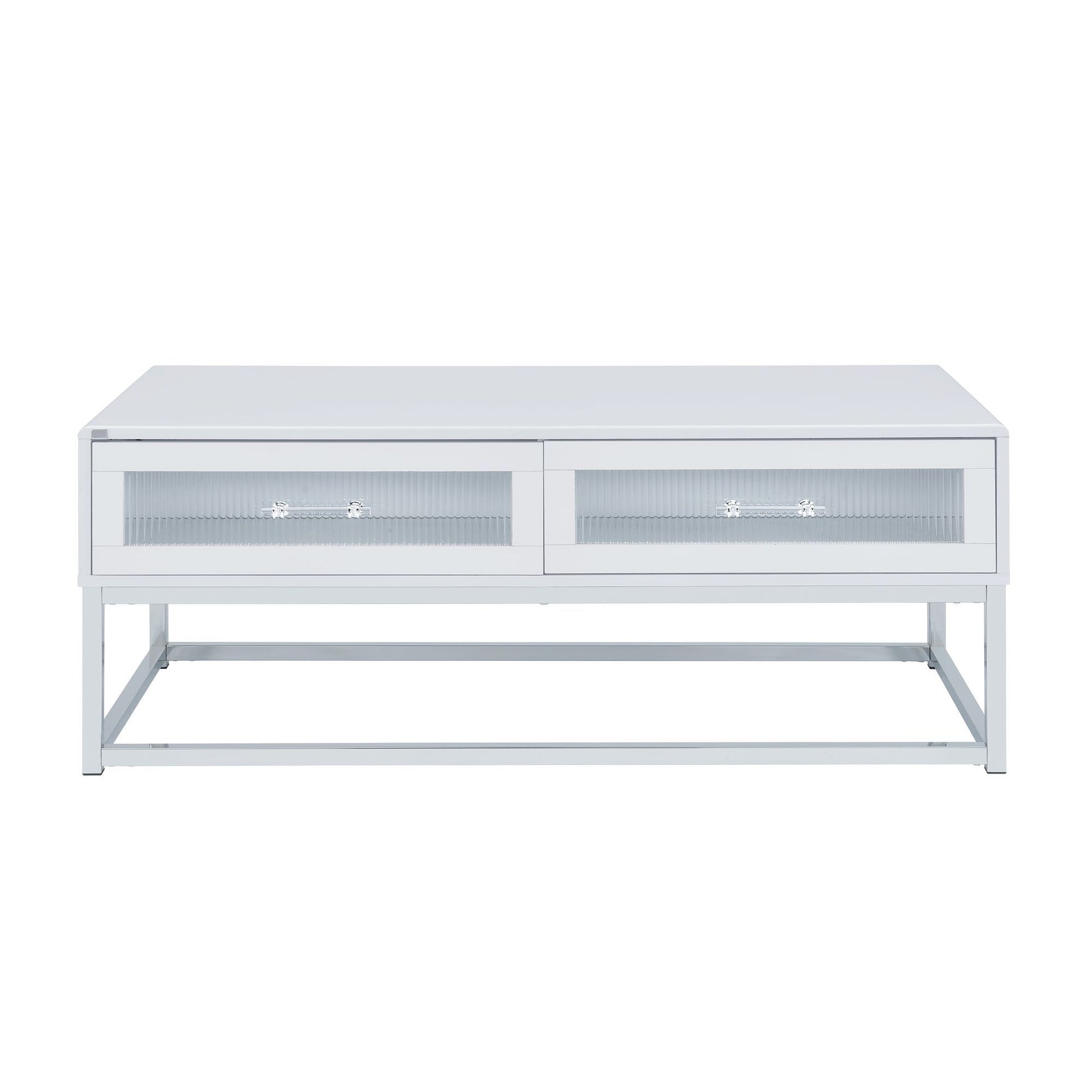 Add a touch of modern elegance to your living room with the Chandra Coffee Table. This stunning table features a glossy white finish and a sleek chrome-finished metal base, creating a contemporary look that will elevate any space. The RGB LED lights add a pop of color and ambiance, while the spacious drawers provide ample storage for your essentials. The acrylic handles add a touch of sophistication and style to the overall design. Bring stylish functionality to your home with the Chandra Coffee Table.