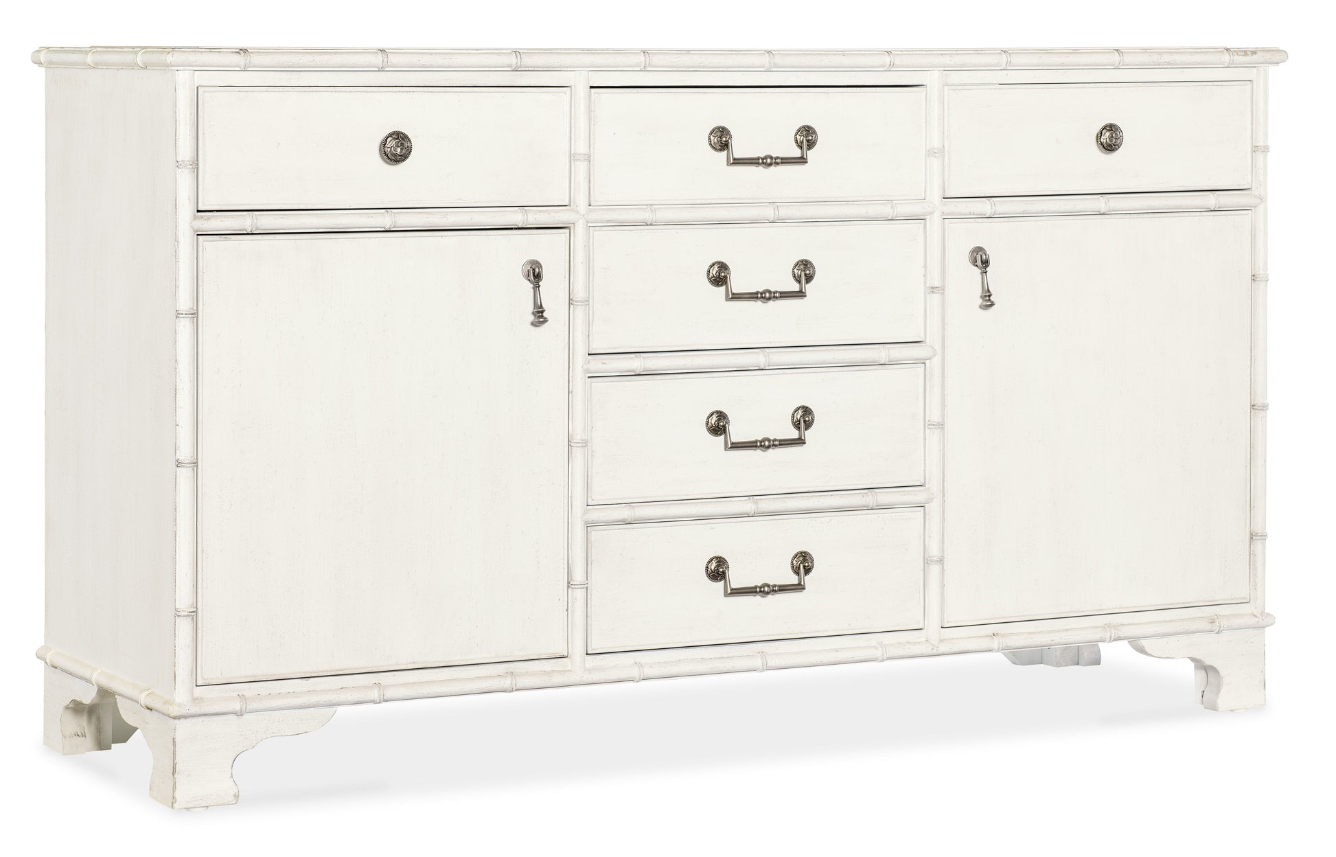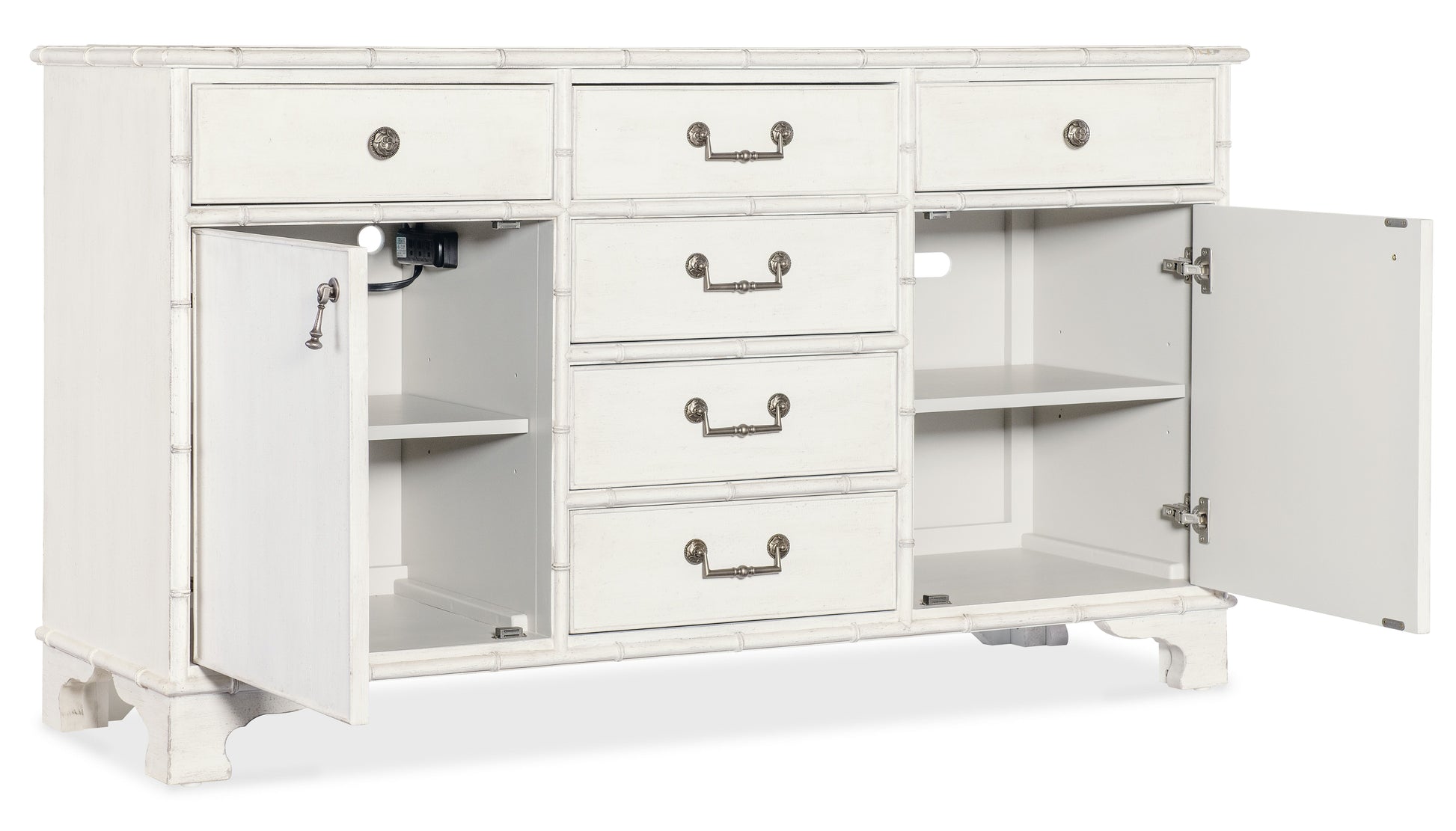 Capturing the vintage charm of the coastal South and the tropical craftsmanship of the West Indies, the Charleston Bungalow Buffet is crafted of wood and resin with a Solid Wood Edge top and bamboo-motif accents. It has two doors with soft-close hinges, and six drawers with self-closing drawer guides. The top left drawer has a removable felt liner and the top right drawer has a removable felt silverware tray. There’s one adjustable shelf behind each door and a ventilated back panel. It is finished in White Heron, a softer interpretation of the classic Southern limestone white with a slightly brighter sheen, delivering an heirloom-quality finish.