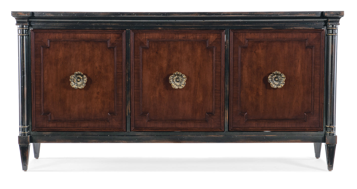 Heirloom quality meets a fresh traditional design interpretation and modern functionality in the Charleston Entertainment Console. With three doors with soft-close hinges and one adjustable shelf behind each, the console is crafted of Cherry and Walnut Veneers with Walnut Inlay and a Solid-Wood Edge top. The exterior finish is Black Cherry patina with subtle distressing and accented by handpainting on the drop-front. The door fronts are finished in Maraschino Cherry using natural grain Cherry Veneers showcasing the dramatic cathedral structure with the selective inclusion of naturally occurring knots to deliver a rich warm cherry finish. The custom floral decorative pulls feature an antique bronze color. Accommodates a 70-inch TV.