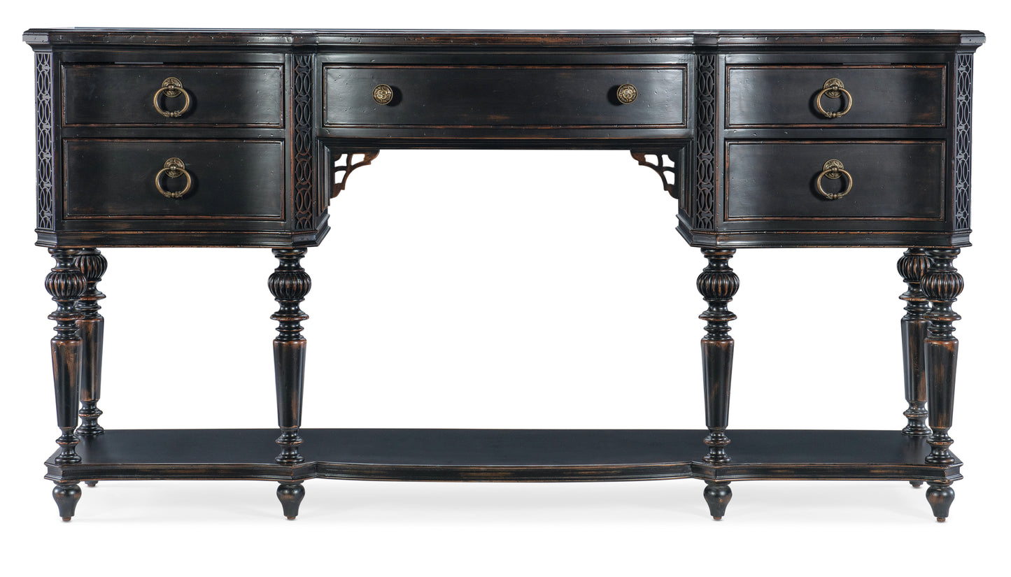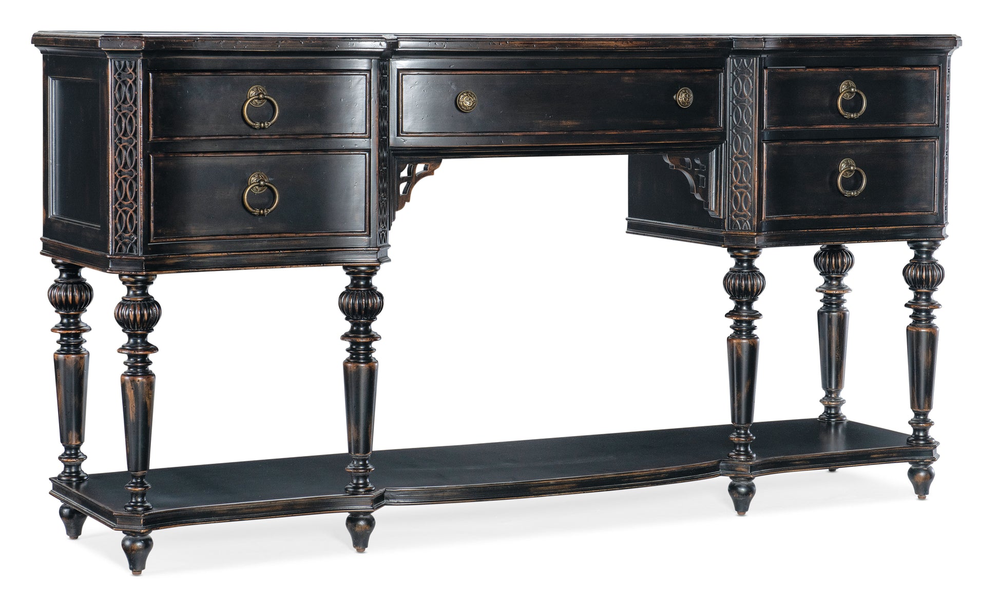 This heirloom-quality server honors the sophisticated beauty and drama of the Federal and Georgian design periods. Crafted of Cherry Veneers with a Solid-Wood Edge top, it is finished in the vibrant Black Cherry patina with subtle distressing. Designer accents include fretwork on the edges, scroll brackets below the center drawer, six turned, carved legs and decorative ring pulls and carved round knob hardware in an antique bronze color. There are five self-closing drawers, each with cherry finish on the drawer interiors. The left and right top drawers have removable felt liners and the center drawer has a removable felt-lined silverware tray. Shaped bottom shelf.