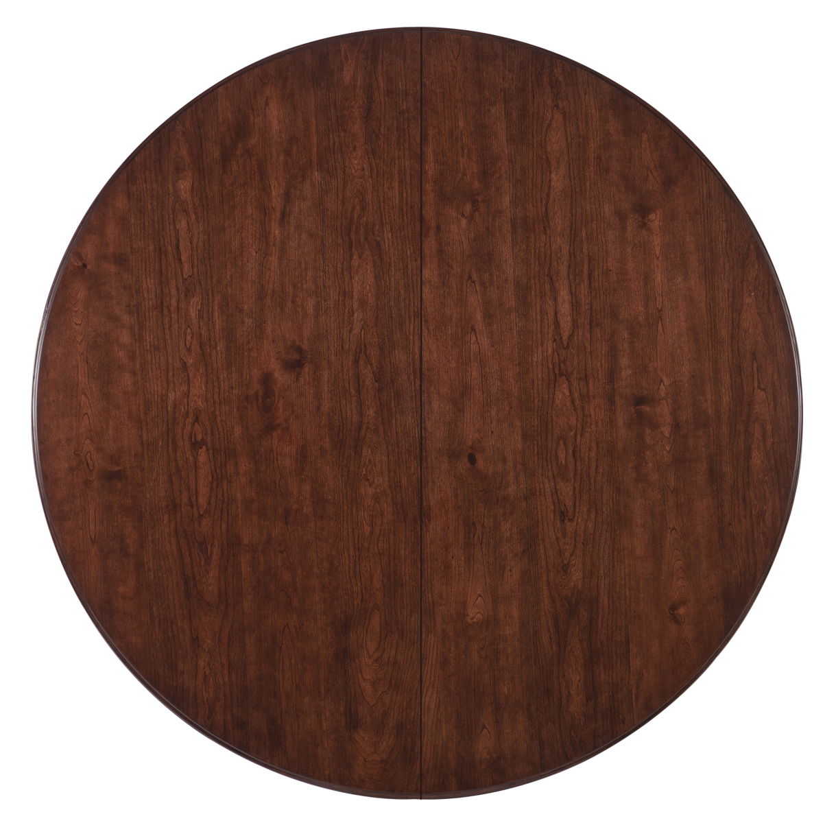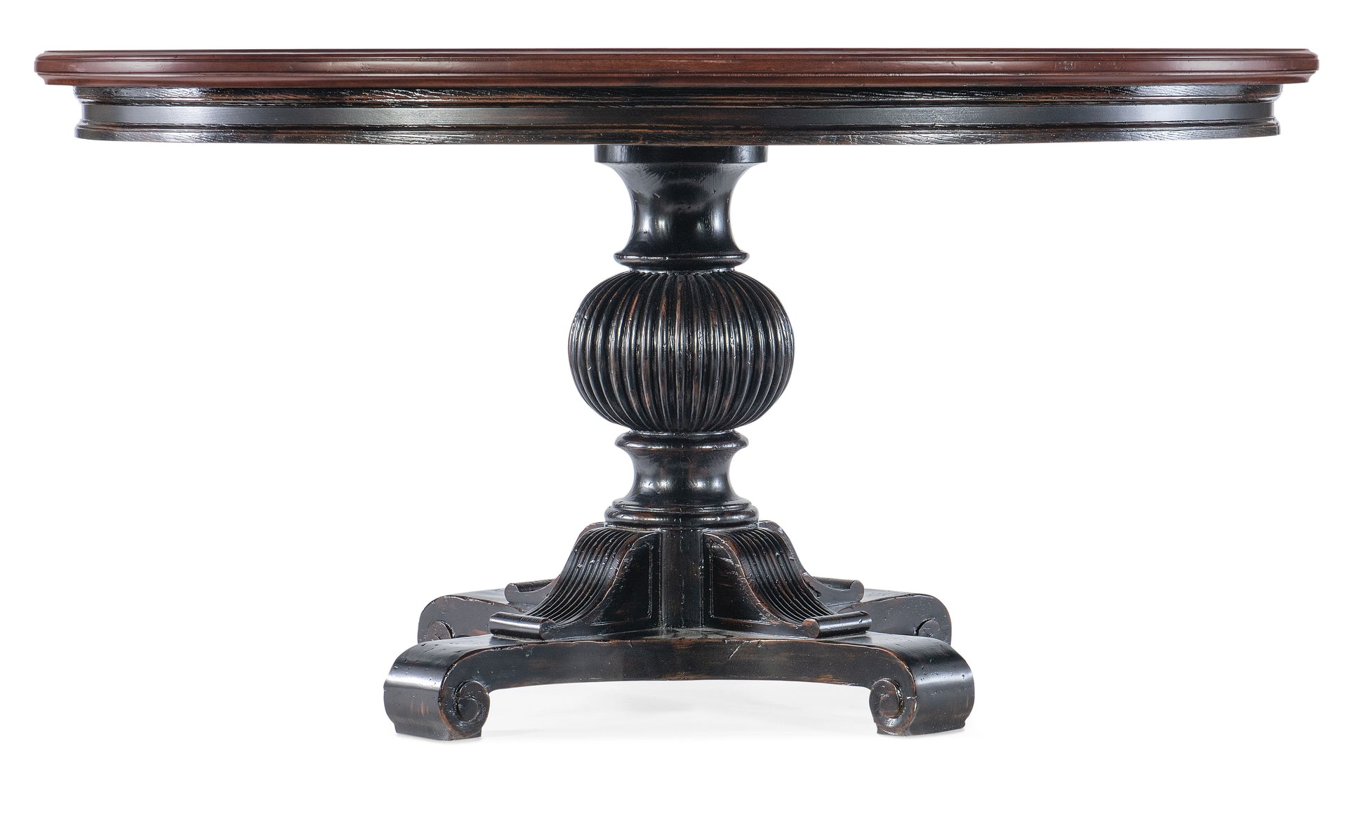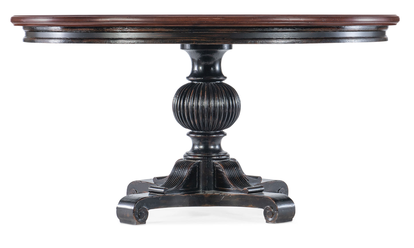 With a warm venerable beauty, the Charleston Round Pedestal Dining Table has an intricately carved pedestal base and a contrasting finish on the tabletop and base. Crafted of Cherry Veneers with Resin and a Solid-Wood Edge top, the base is in the vibrant Black Cherry patina with an heirloom quality. The tabletop is in Maraschino Cherry, using natural grain Cherry Veneers showcasing the dramatic cathedral structure with selective inclusion of naturally-occurring knots to deliver a rich warm cherry finish and a smooth sophisticated aesthetic. One 20-inch leaf extends the table to 74 inches long, allowing it to accommodate up to 8 coordinating chairs. Without the leaf, it accommodates up to 6 coordinating chairs.