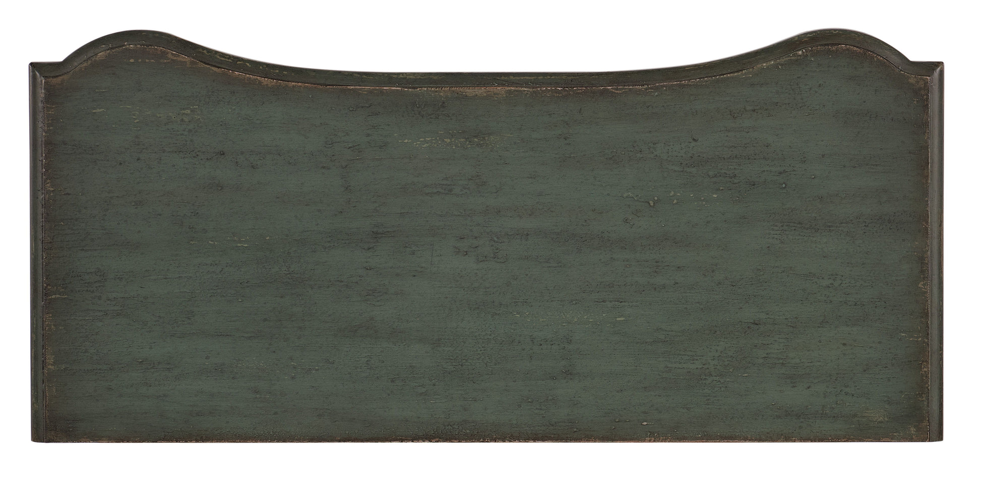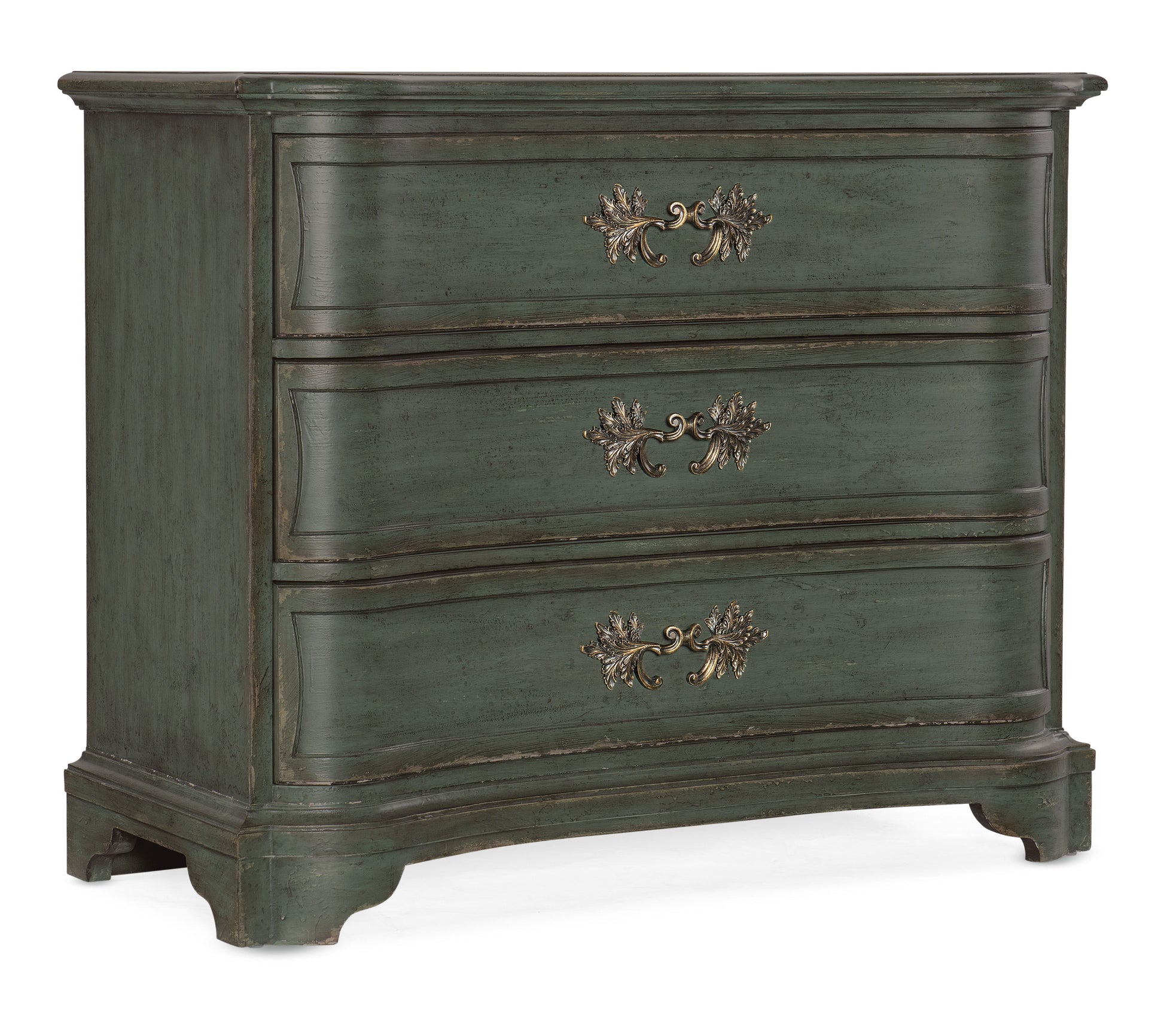 Capturing the vintage charm of the coastal South and the tropical craftsmanship of the West Indies, the Charleston Three-Drawer Accent Chest has scalloped legs and dramatic decorative pulls in a carved leaf motif in an antique bronze color. Crafted of Maple Veneers, the chest is finished in Gullah Green, a deep teal-blue reminiscent of the mysterious waters within wetlands and marshes of the American South. The 3 self-closing drawers have an interior color matching the exterior.