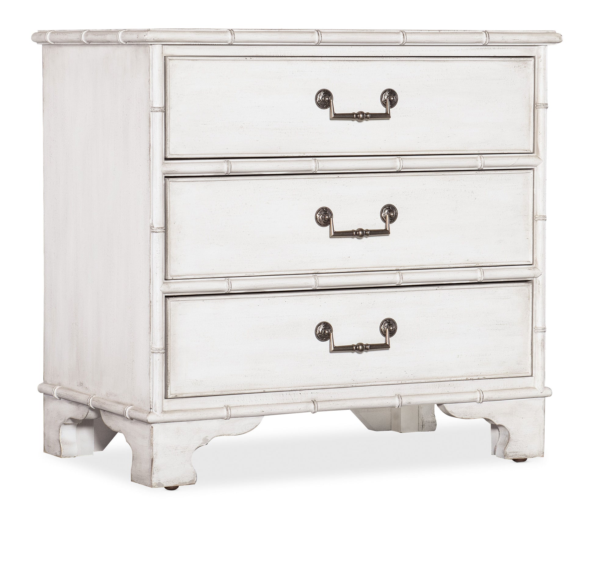 Inspired by the tropical craftsmanship of the West Indies and the cane accents of the classic British and Dutch Colonial design periods, the Charleston Nightstand has bamboo-motif trim and three drawers with self-closing drawer guides. The wood nightstand is finished in White Heron, a softer interpretation of the classic Southern limestone white with a slightly brighter sheen, delivering an heirloom-quality finish. The drawer interiors are painted gray, and the exteriors have antique pewter-colored decorative bail pulls.